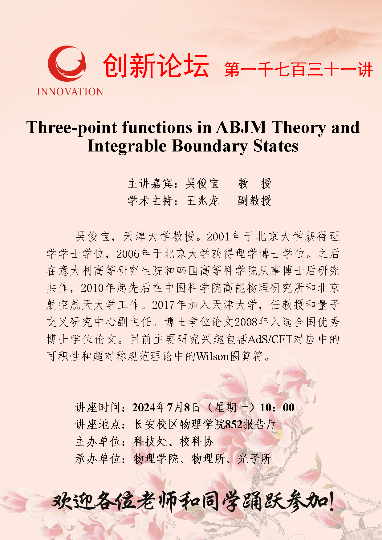吴俊宝 教授 广发体育创新论坛第一千七百三十一讲:Three-point functions in ABJM Theory and Integrable Boundary States 讲座时间 2024年7月8日(星期一)10:00 讲座地点 长安校区物理学院852报告厅 讲座人介绍 吴俊宝 教授 讲座内容