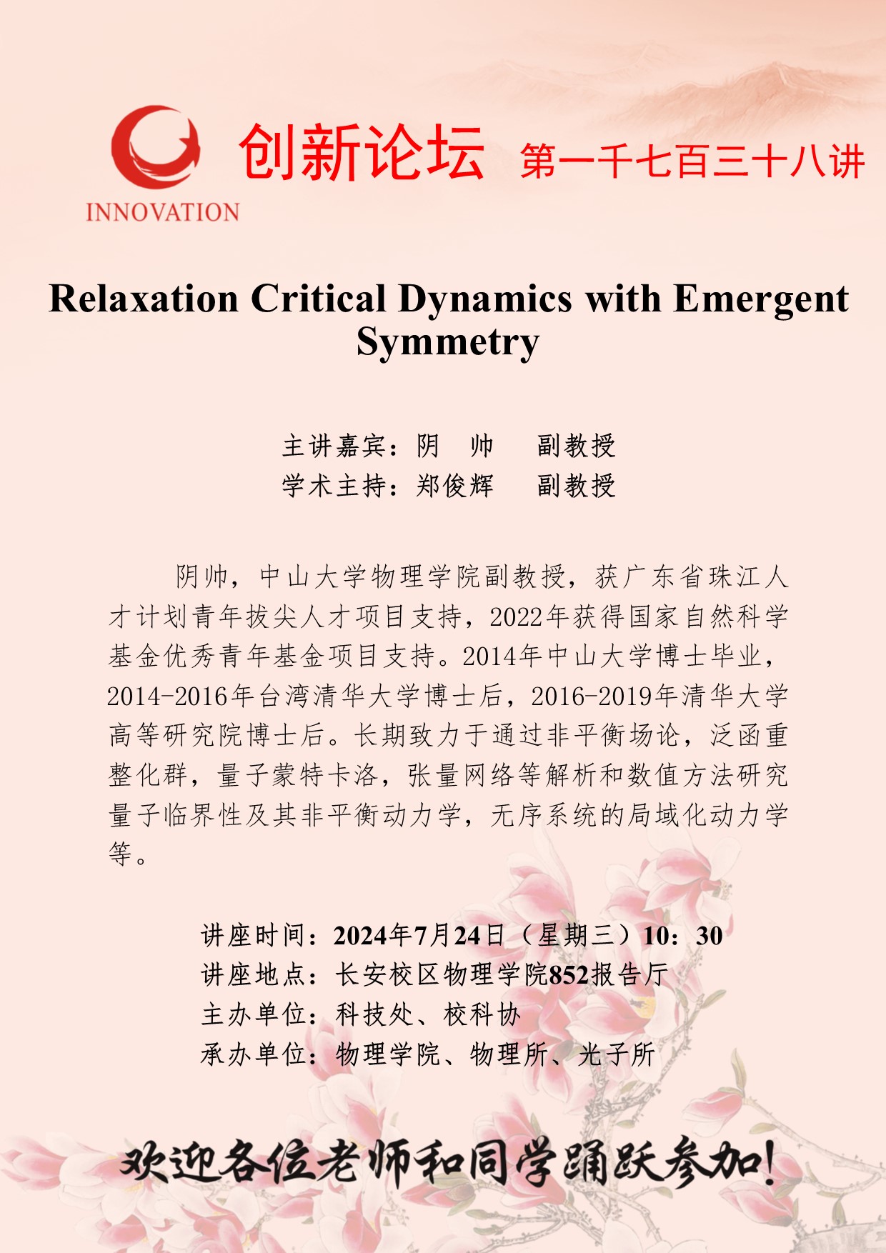 阴帅 副教授 广发体育创新论坛第一千七百三十八讲:Relaxation Critical Dynamics with Emergent Symmetry 讲座时间 2024年7月24日(星期三)10:30 讲座地点 长安校区物理学院852报告厅 讲座人介绍 阴帅 副教授 讲座内容
