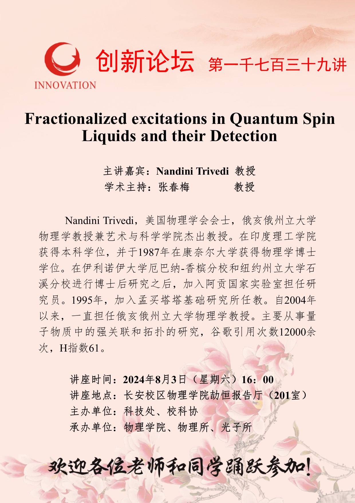 Nandini Trivedi 教授 广发体育创新论坛第一千七百三十九讲:Fractionalized excitations in Quantum Spin Liquids and their Detection 讲座时间 2024年8月3日(星期六)16:00 讲座地点 长安校区物理学院劼恒报告厅(201室) 讲座人介绍 Nandini Trivedi 教授 讲座内容
