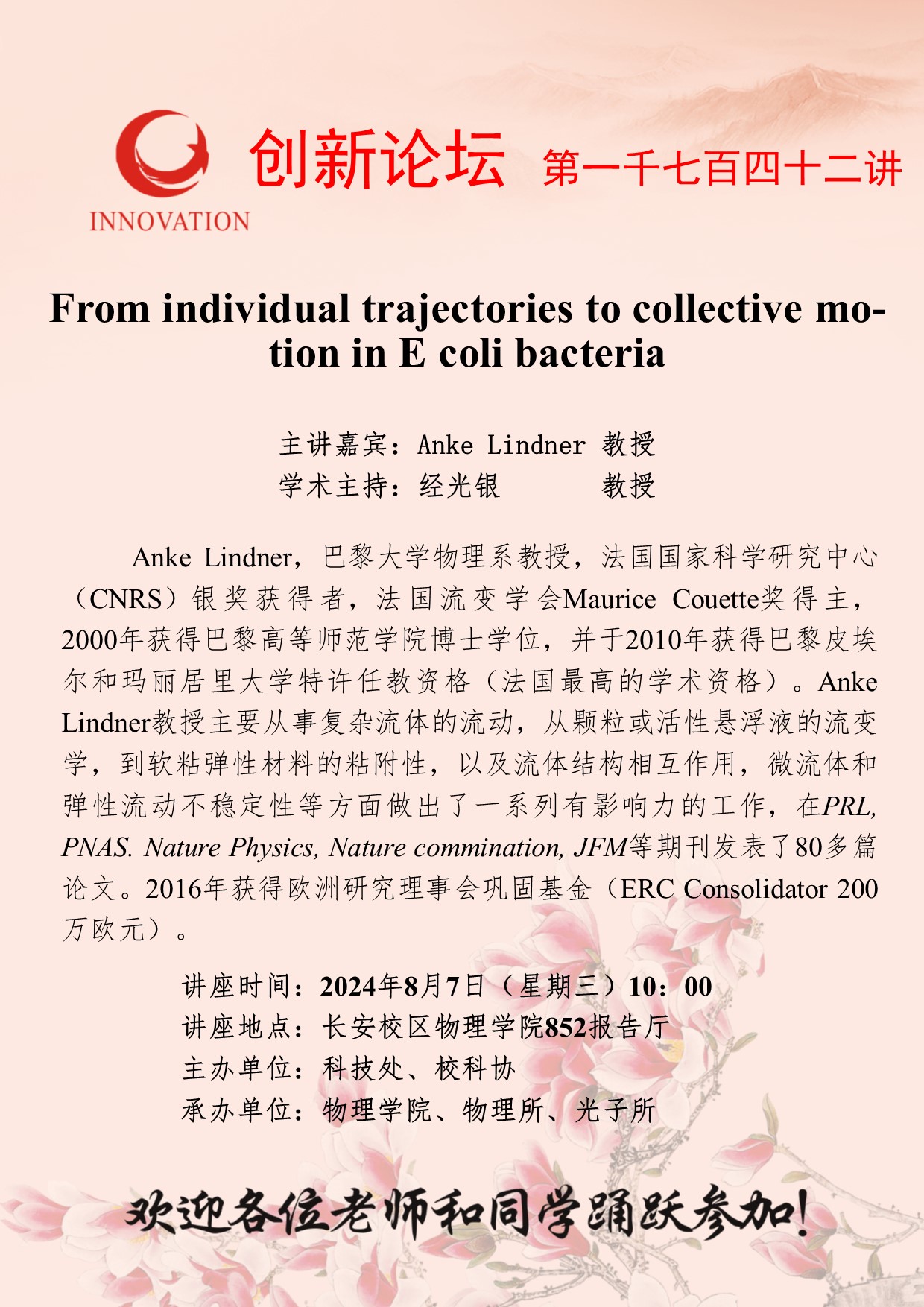Anke Lindner 教授 广发体育创新论坛第一千七百四十二讲:From individual trajectories to collective motion in E coli bacteria 讲座时间 2024年8月7日(星期三)10:00 讲座地点 长安校区物理学院852报告厅 讲座人介绍 Anke Lindner 教授 讲座内容