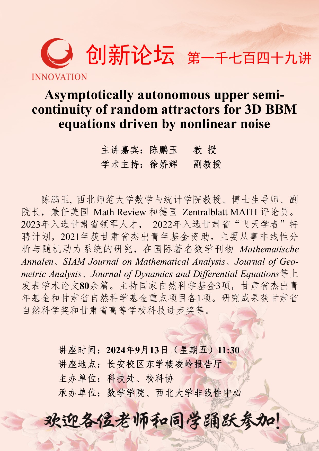 陈鹏玉 教授 广发体育创新论坛第一千七百四十九讲:Asymptotically autonomous upper semi-continuity of random attractors for 3D BBM equations driven by nonlinear noise 讲座时间 2024年9月13日(星期五)11:30 讲座地点 长安校区东学楼凌岭报告厅 讲座人介绍 陈鹏玉 教授 讲座内容