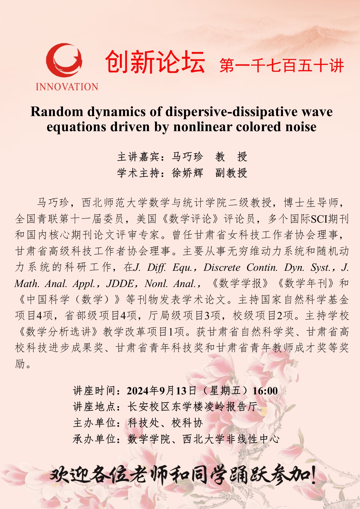 马巧珍 教授 广发体育创新论坛第一千七百五十讲:Random dynamics of dispersive-dissipative wave equations driven by nonlinear colored noise 讲座时间 2024年9月13日(星期五)16:00 讲座地点 长安校区东学楼凌岭报告厅 讲座人介绍 马巧珍 教授 讲座内容