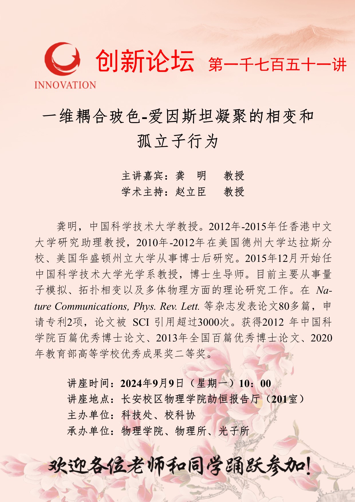 龚明 教授 广发体育创新论坛第一千七百五十一讲:一维耦合玻色-爱因斯坦凝聚的相变和孤立子行为 讲座时间 2024年9月9日(星期一)10:00 讲座地点 长安校区物理学院劼恒报告厅(201室) 讲座人介绍 龚明 教授 讲座内容