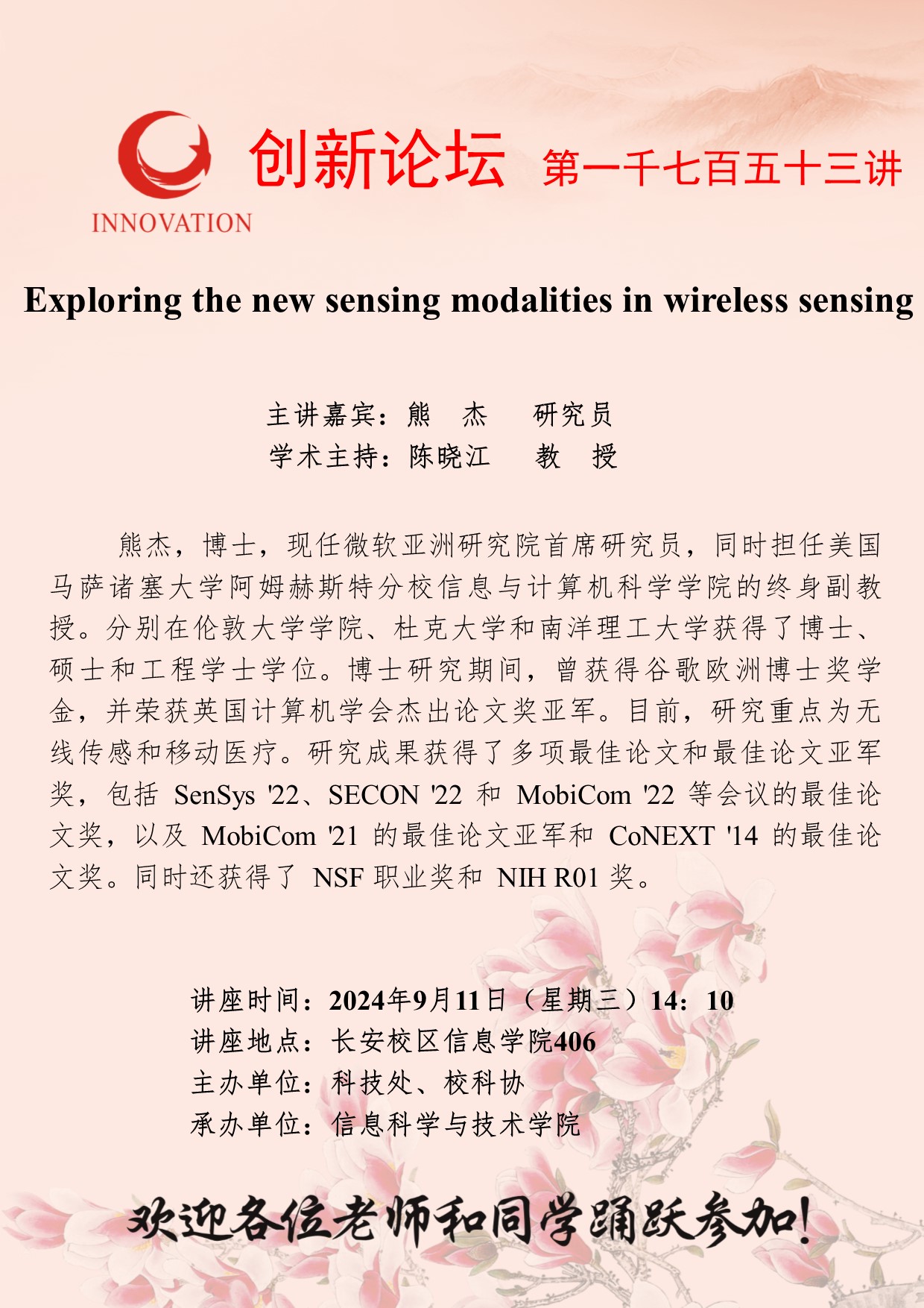 熊杰 研究员 广发体育创新论坛第一千七百五十三讲:Exploring the new sensing modalities in wireless sensing 讲座时间 2024年9月11日(星期三)14:10 讲座地点 长安校区信息学院406 讲座人介绍 熊杰 研究员 讲座内容
