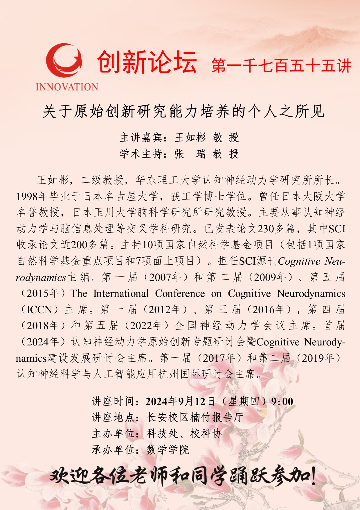 王如彬 教授 广发体育创新论坛第一千七百五十五讲:关于原始创新研究能力培养的个人之所见 讲座时间 2024年9月12日(星期四)9:00 讲座地点 长安校区楠竹报告厅 讲座人介绍 王如彬 教授 讲座内容