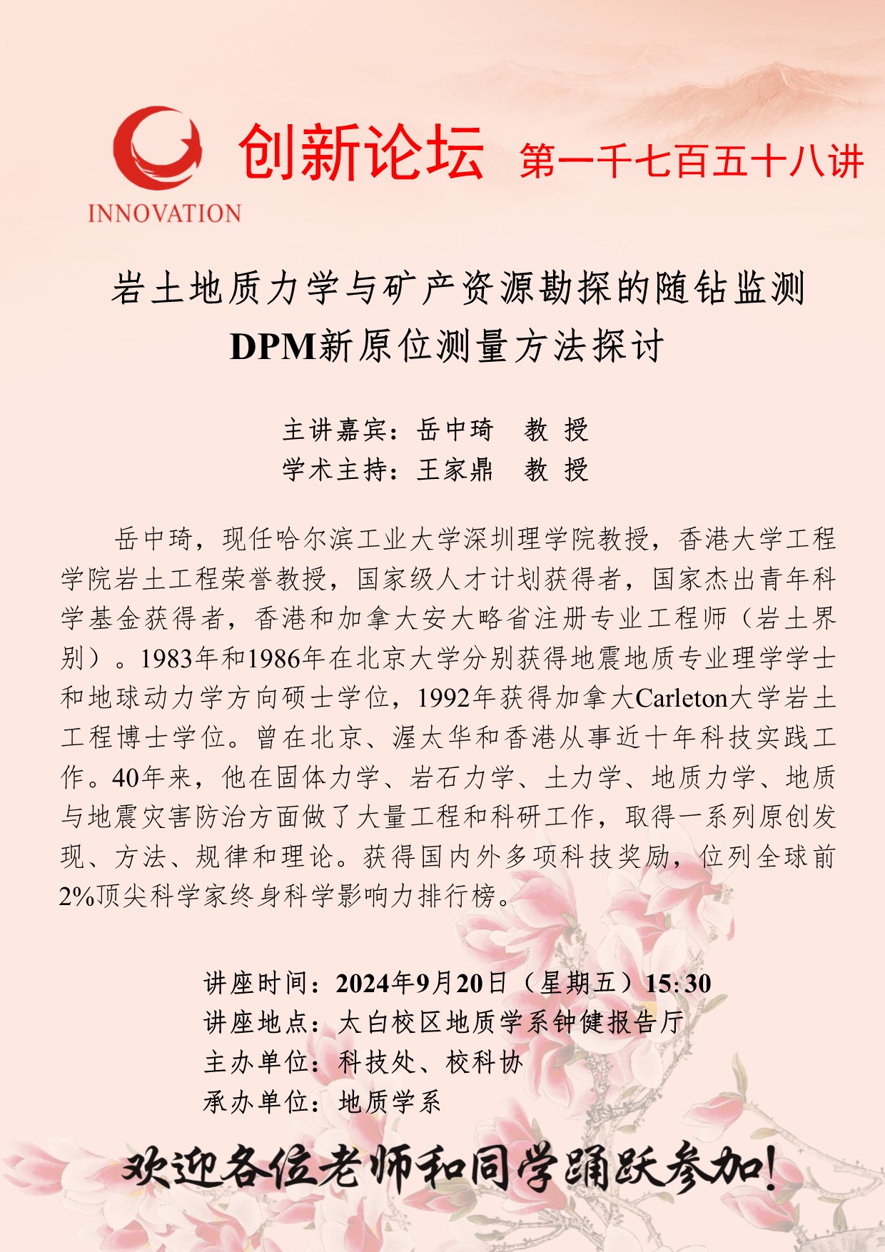 岳中琦 教授 广发体育创新论坛第一千七百五十八讲:岩土地质力学与矿产资源勘探的随钻监测 DPM新原位测量方法探讨 讲座时间 2024年9月20日(星期五) 15:30 讲座地点 太白校区地质学系钟健报告厅 讲座人介绍 岳中琦 教授 讲座内容