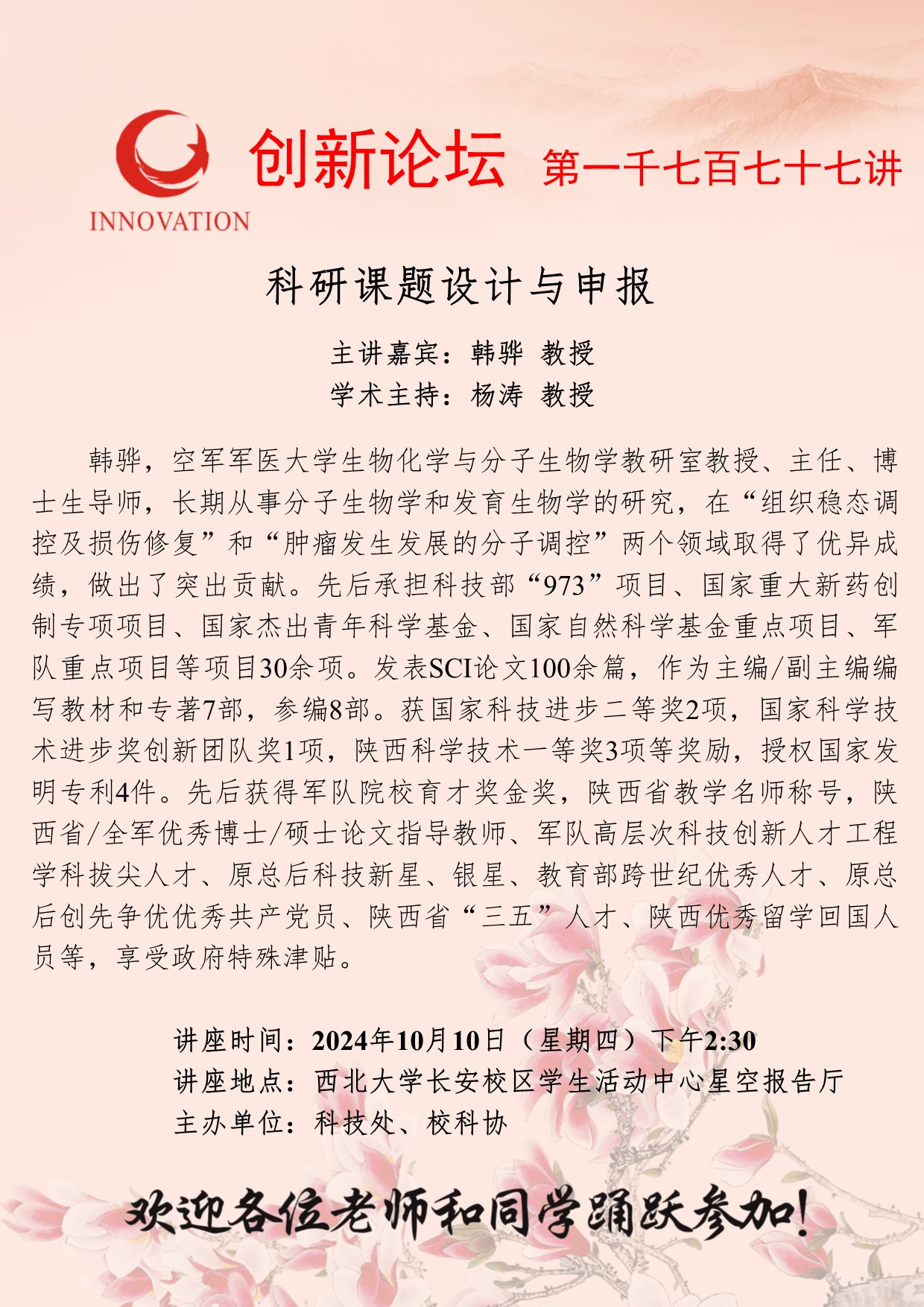韩骅 教授 广发体育创新论坛第一千七百七十七讲:科研课题设计与申报 讲座时间 2024年10月10日(星期四)下午2:30 讲座地点 广发体育长安校区学生活动中心星空报告厅 讲座人介绍 韩骅 教授 讲座内容