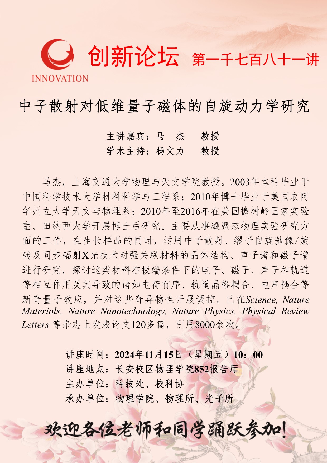马杰 教授 广发体育创新论坛第一千七百八十一讲:中子散射对低维量子磁体的自旋动力学研究 讲座时间 2024年11月15日(星期五)10:00 讲座地点 长安校区物理学院852报告厅 讲座人介绍 马杰 教授 讲座内容