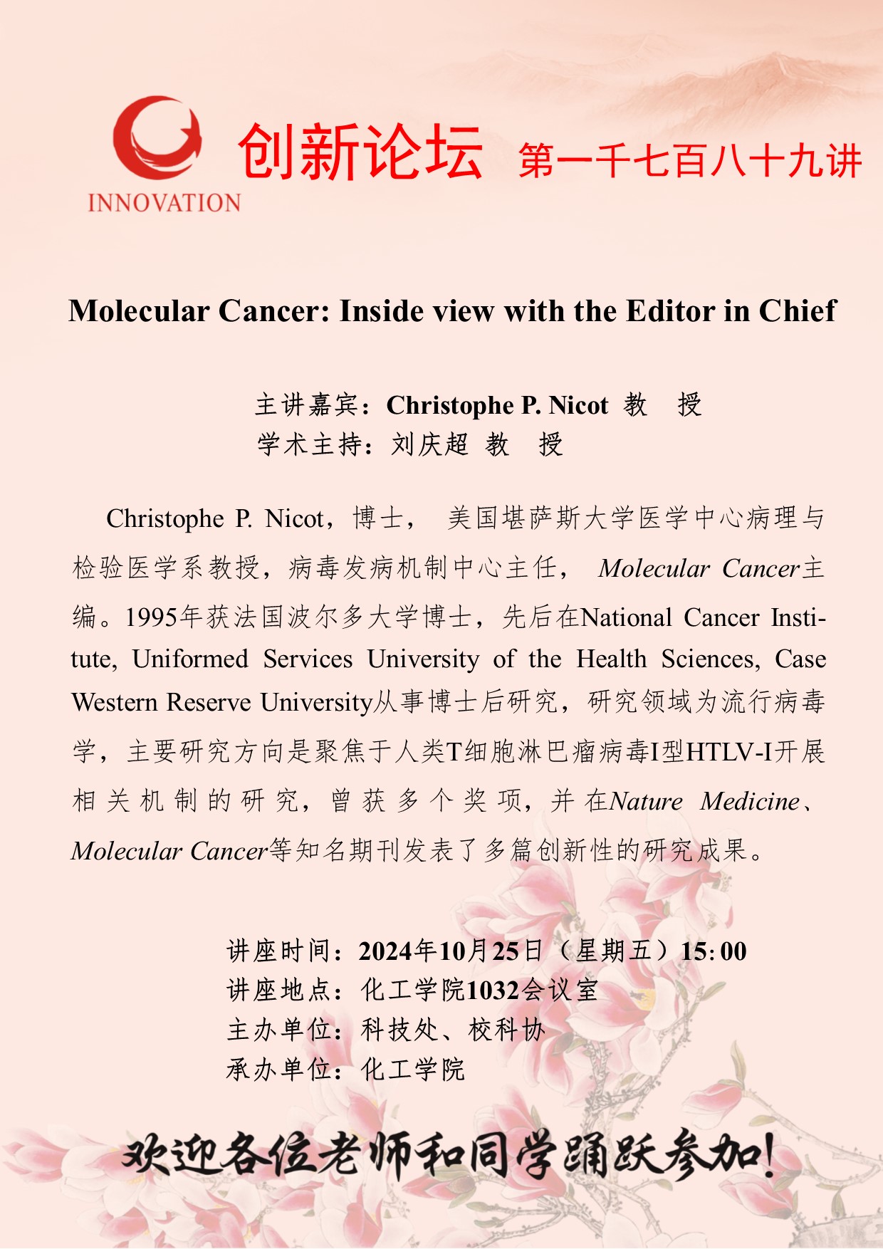 Christophe P. Nicot 教授 广发体育创新论坛第一千七百八十九讲:Molecular Cancer: Inside view with the Editor in Chief 讲座时间 2024年10月25日(星期五)15:00 讲座地点 化工学院1032会议室 讲座人介绍 Christophe P. Nicot 教授 讲座内容