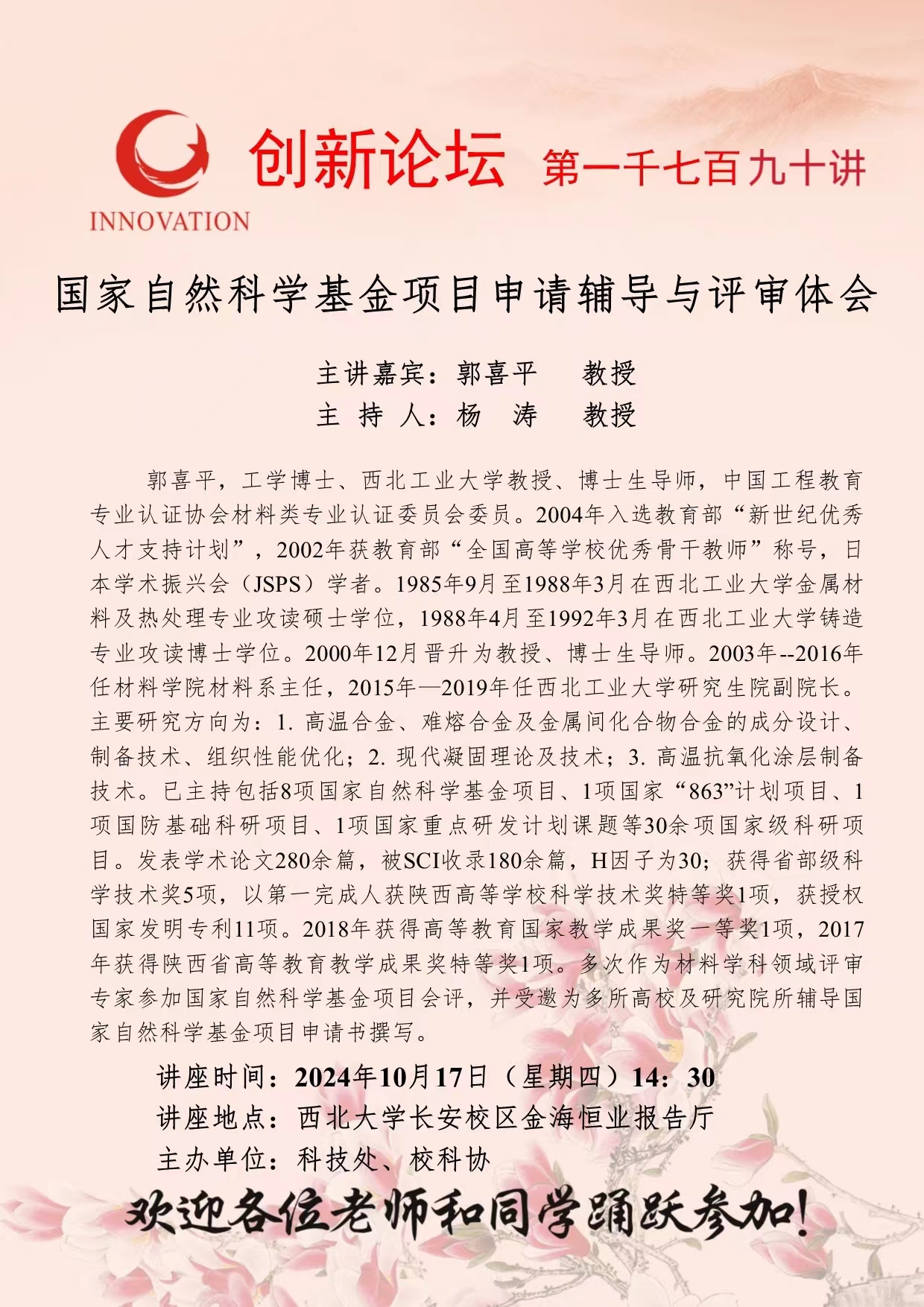 郭喜平 教授 广发体育创新论坛第一千七百九十讲:国家自然科学基金项目申请辅导与评审体会 讲座时间 2024年10月17日(星期四)下午2:30 讲座地点 广发体育长安校区金海恒业报告厅 讲座人介绍 郭喜平 教授 讲座内容