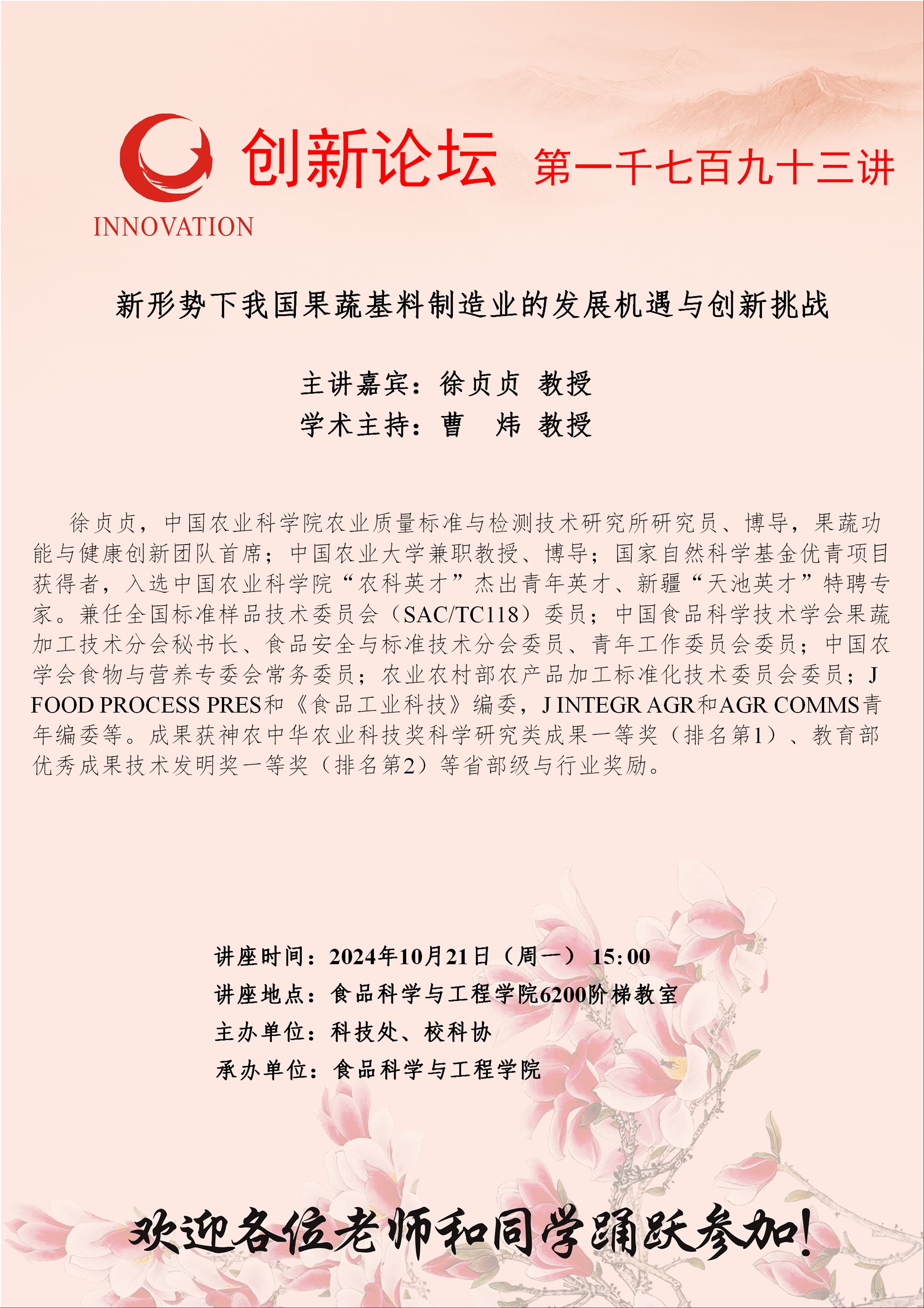 徐贞贞 教授 广发体育创新论坛第一千七百九十三讲: 新形势下我国果蔬基料制造业的发展机遇与创新挑战 讲座时间 2024年10月21日(星期一)15:00 讲座地点 太白校区食品科学与工程学院6200阶梯教室 讲座人介绍 徐贞贞 教授 讲座内容