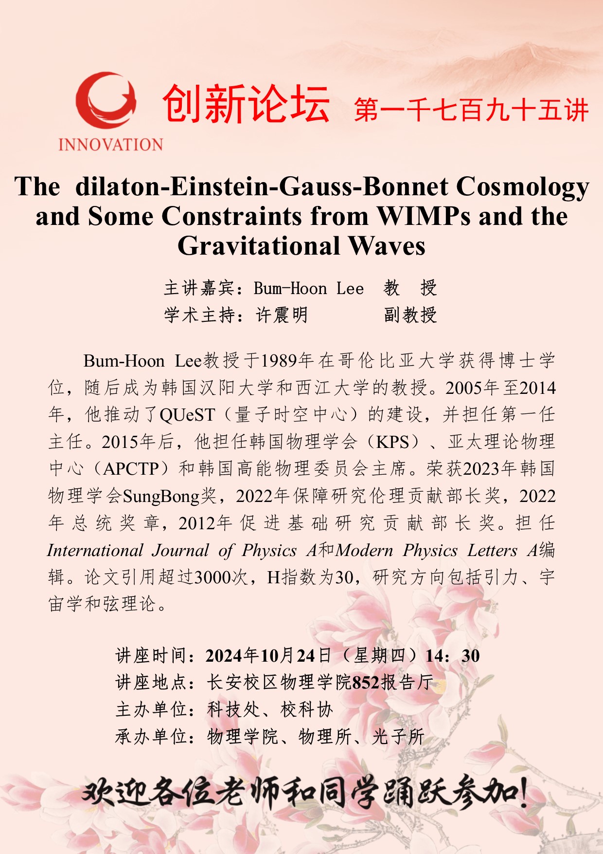 Bum-Hoon Lee 教授 广发体育创新论坛第一千七百九十五讲:The dilaton-Einstein-Gauss-Bonnet Cosmology and Some Constraints from WIMPs and the Gravitational Waves 讲座时间 2024年10月24日(星期四)14:30 讲座地点 长安校区物理学院852报告厅 讲座人介绍 Bum-Hoon Lee 教授 讲座内容