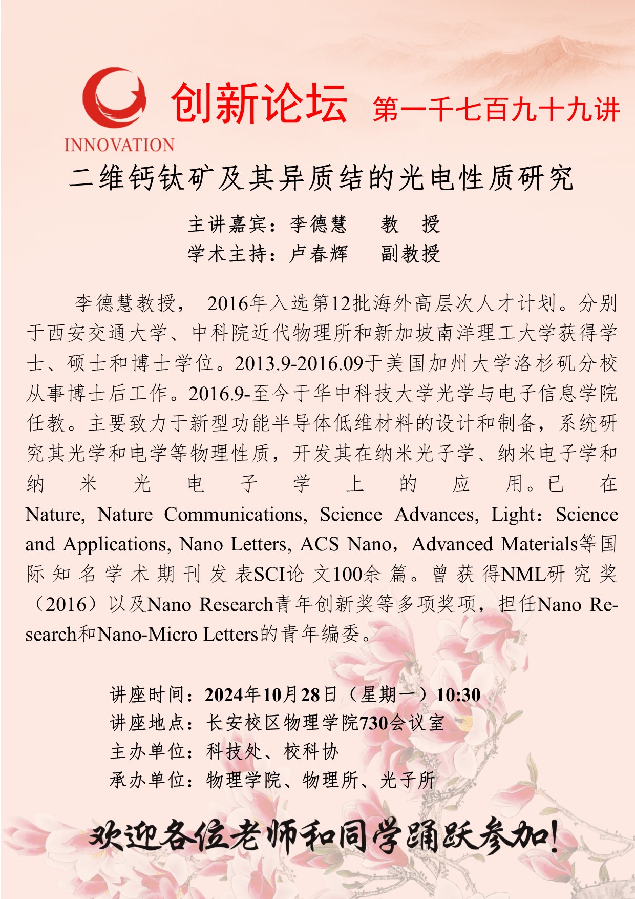 李德慧 教授 广发体育创新论坛第一千七百九十九讲:二维钙钛矿及其异质结的光电性质研究 讲座时间 2024年10月28日(星期一)10:30 讲座地点 长安区物理学院730会议室 讲座人介绍 李德慧 教授 讲座内容