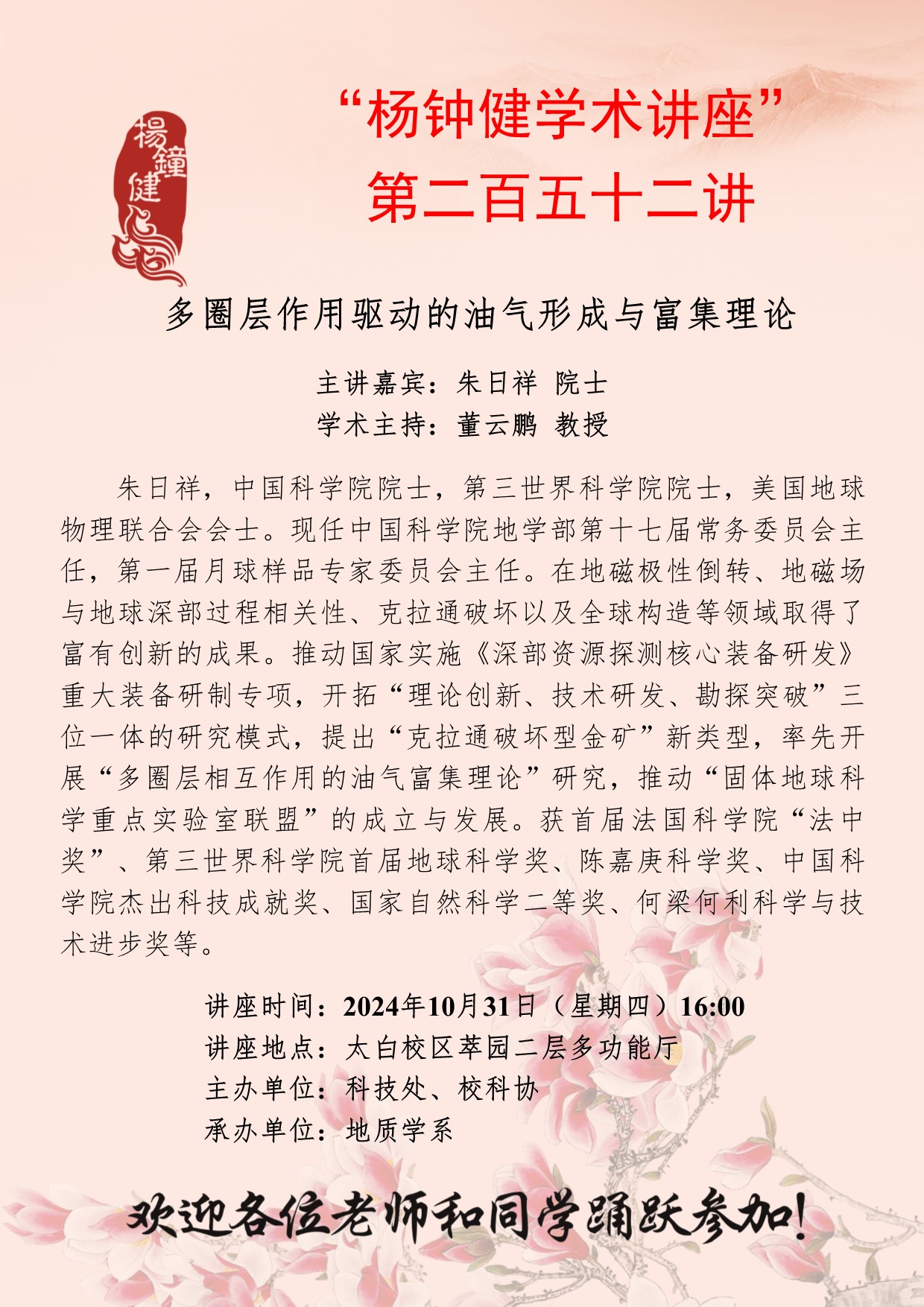 朱日祥 院士 “杨钟健学术讲座”第二百五十二讲:多圈层作用驱动的油气形成与富集理论 讲座时间 2024年10月31日(星期四)16:00 讲座地点 太白校区萃园二层多功能厅 讲座人介绍 朱日祥 院士 讲座内容
