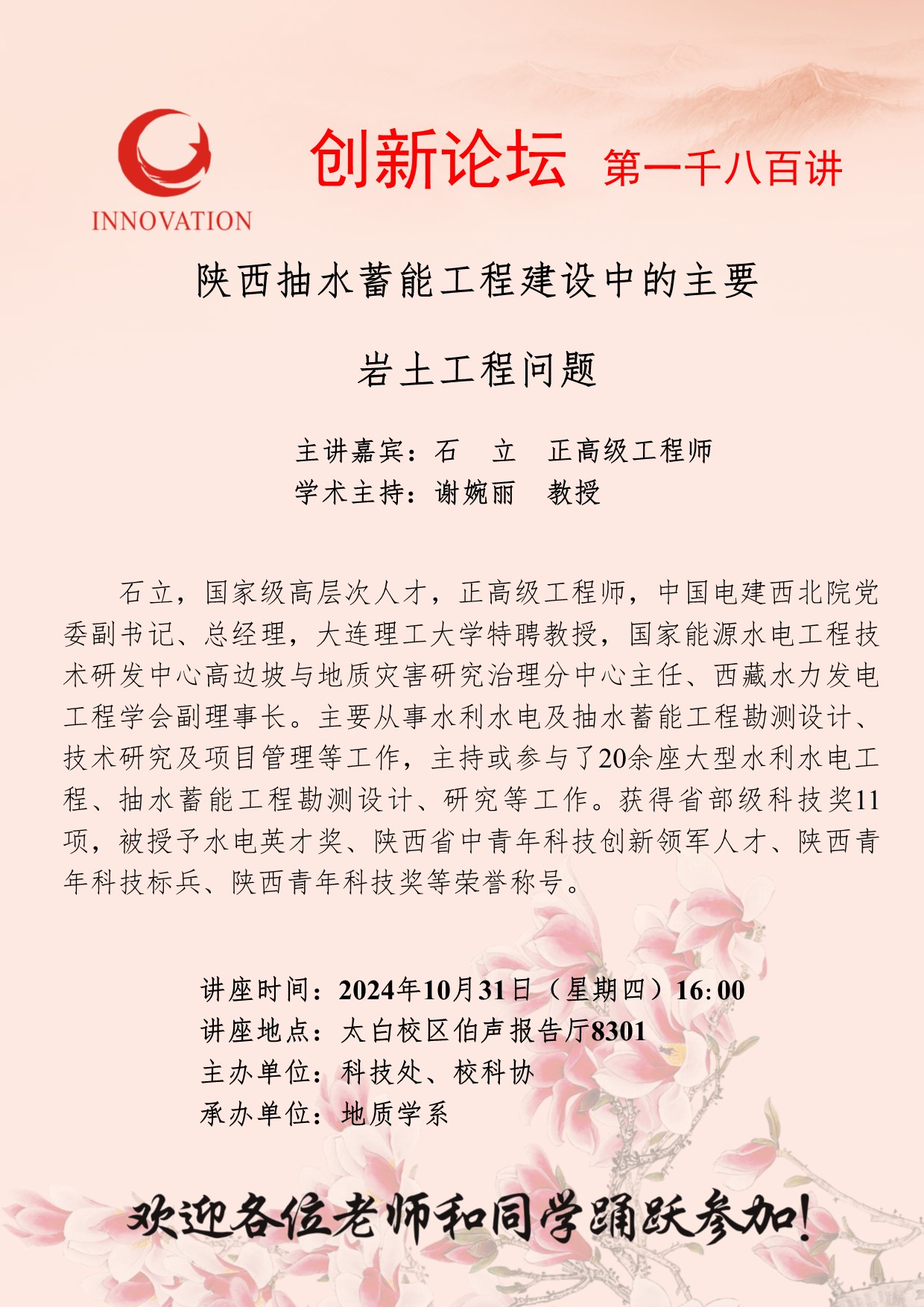 石 立 正高级工程师 广发体育创新论坛第一千八百讲:陕西抽水蓄能工程建设中的主要岩土工程问题 讲座时间 2024年10月31日(星期四)16:00 讲座地点 太白校区伯声报告厅8301 讲座人介绍 石 立 正高级工程师 讲座内容