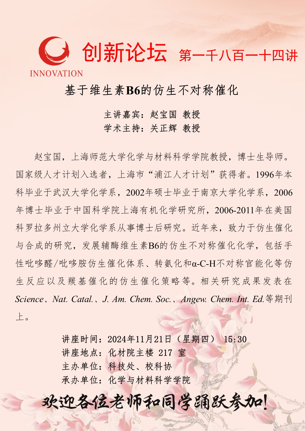赵宝国 教授 广发体育创新论坛第一千八百一十四讲:基于维生素B6的仿生不对称催化 讲座时间 2024年11月21日(星期四) 15:30 讲座地点 化材院主楼 217 室 讲座人介绍 赵宝国 教授 讲座内容