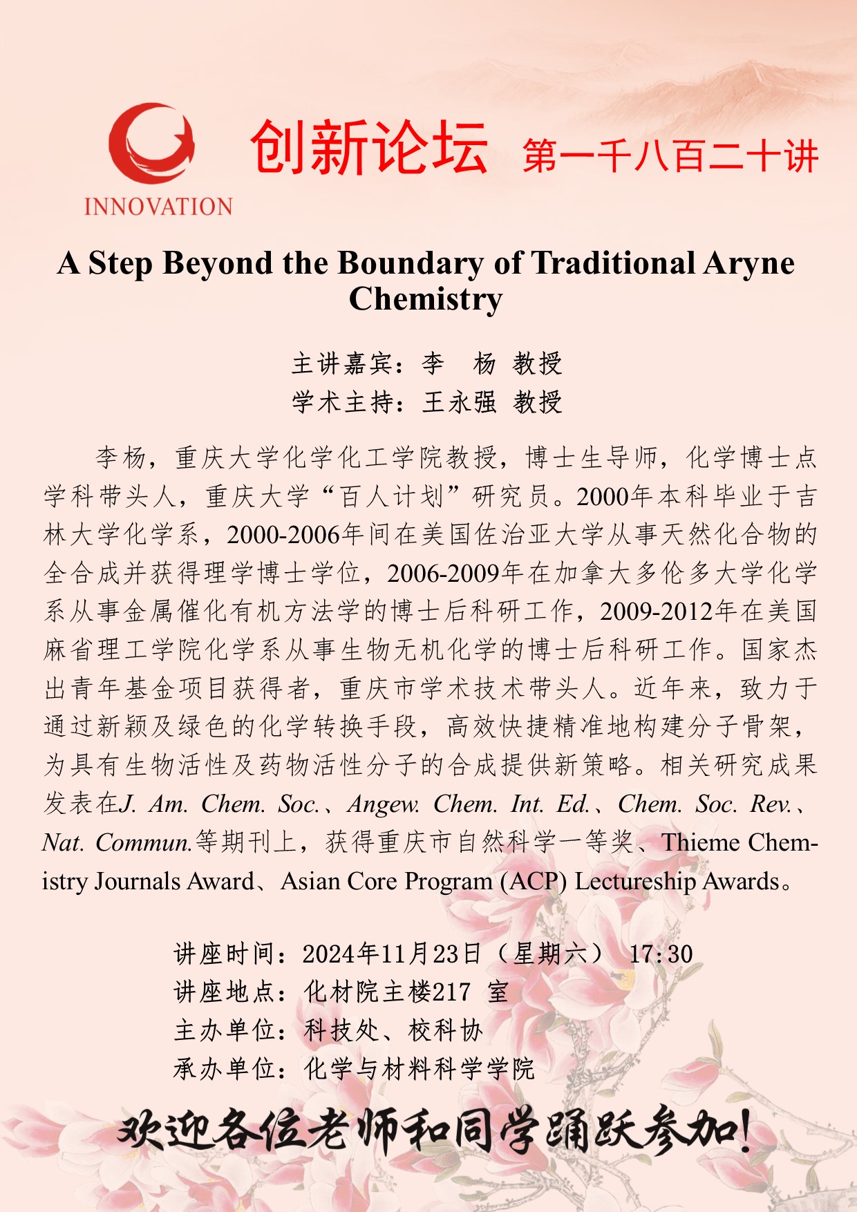 李杨 教授 广发体育创新论坛第一千八百二十讲:A Step Beyond the Boundary of Traditional Aryne Chemistry 讲座时间 2024年11月23日(星期六) 17:30 讲座地点 化材院主楼217室 讲座人介绍 李杨 教授 讲座内容