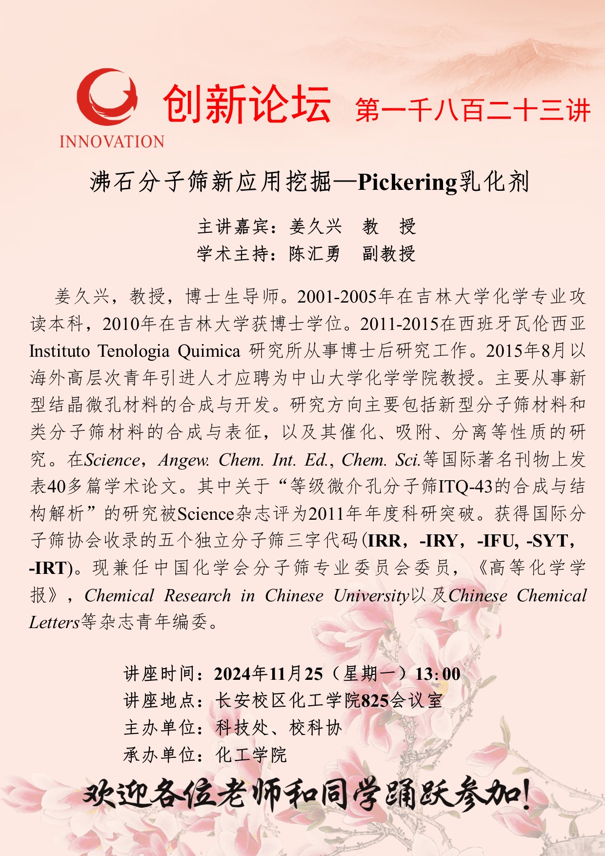 姜久兴 教授 广发体育创新论坛第一千八百二十三讲:沸石分子筛新应用挖掘—Pickering乳化剂 讲座时间 2024年11月25(星期一)13:00 讲座地点 广发体育长安校区化工学院825会议室 讲座人介绍 姜久兴 教授 讲座内容