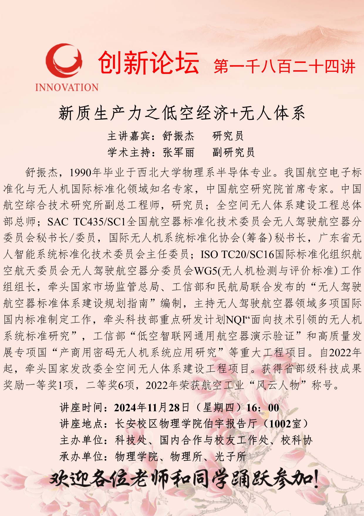 舒振杰 研究员 广发体育创新论坛第一千八百二十四讲:新质生产力之低空经济+无人体系 讲座时间 2024年11月28日(星期四)16:00 讲座地点 长安校区物理学院伯宇报告厅(1002室) 讲座人介绍 舒振杰 研究员 讲座内容