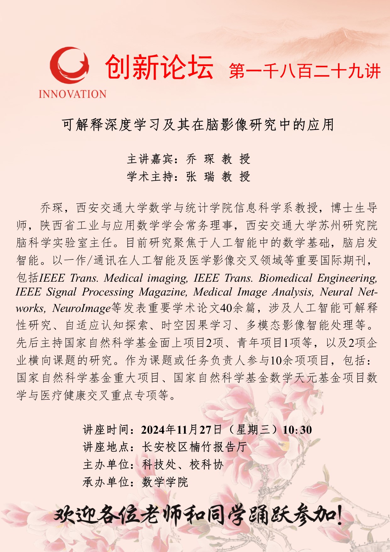 乔琛 教授 广发体育创新论坛第一千八百二十九讲:可解释深度学习及其在脑影像研究中的应用 讲座时间 2024年11月27日(星期三)10:30 讲座地点 长安校区楠竹报告厅 讲座人介绍 乔琛 教授 讲座内容