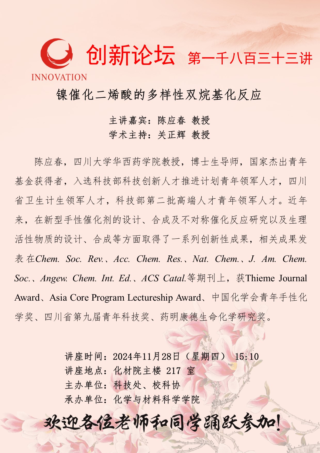 陈应春 教授 广发体育创新论坛第一千八百三十三讲:镍催化二烯酸的多样性双烷基化反应 讲座时间 2024年11月28日(星期四) 15:10 讲座地点 化材院主楼217室 讲座人介绍 陈应春 教授 讲座内容