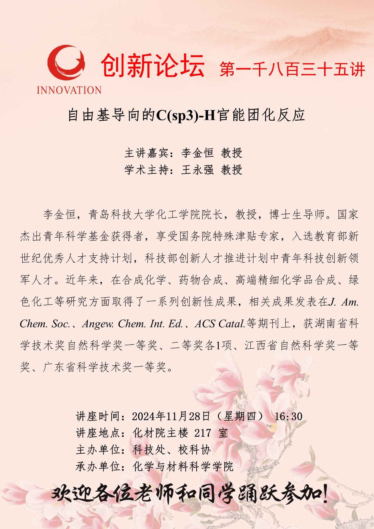李金恒 教授 广发体育创新论坛第一千八百三十五讲:自由基导向的C(sp3)-H官能团化反应 讲座时间 2024年11月28日(星期四) 16:30 讲座地点 化材院主楼217室 讲座人介绍 李金恒 教授 讲座内容
