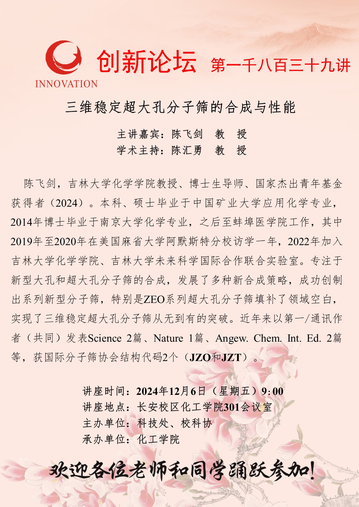 陈飞剑 教授 广发体育创新论坛第一千八百三十九讲:三维稳定超大孔分子筛的合成与性能 讲座时间 2024年12月6日(星期五)9:00 讲座地点 长安校区化工学院301会议室 讲座人介绍 陈飞剑 教授 讲座内容 嗯