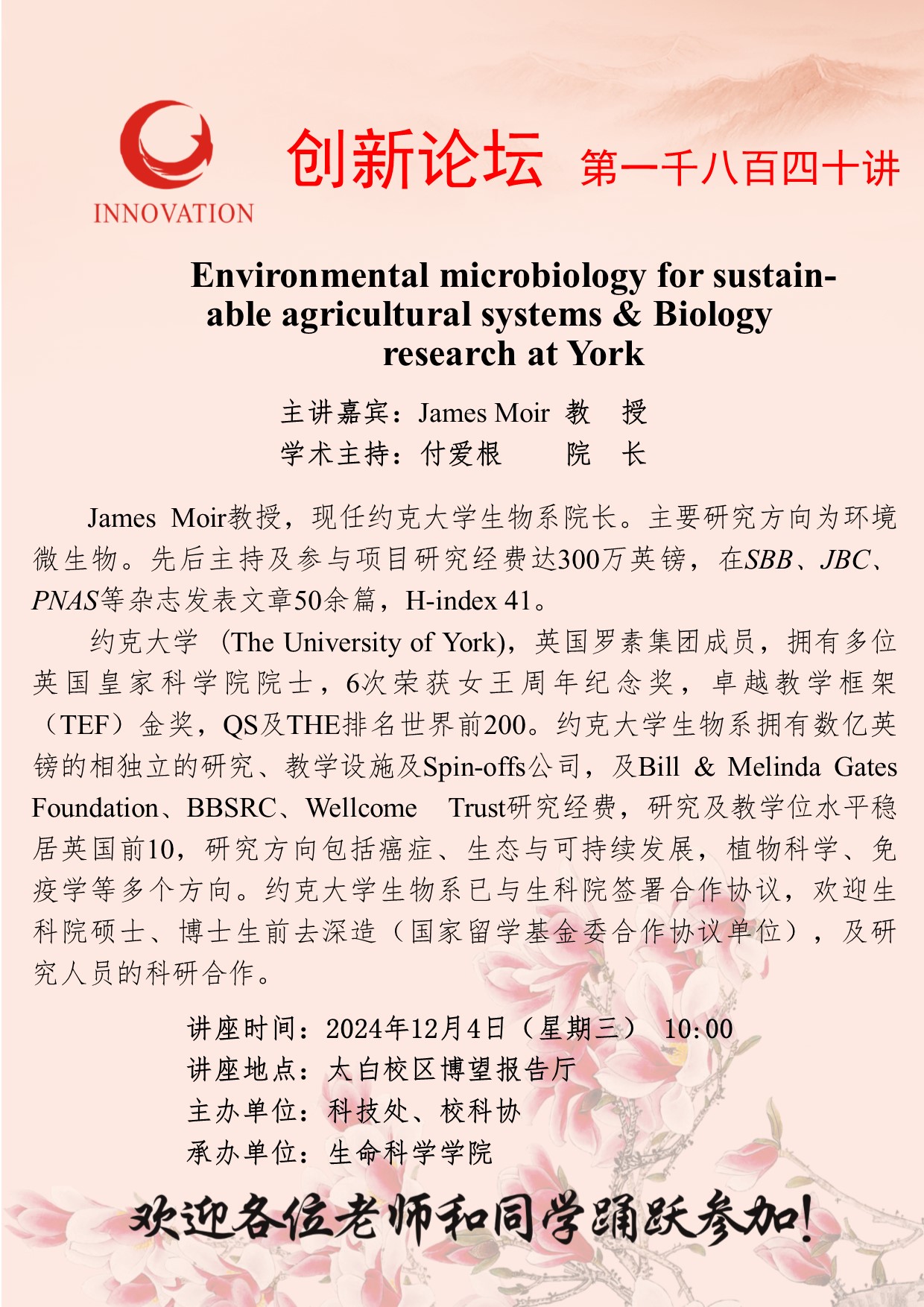 James Moir 教授 广发体育创新论坛第一千八百四十讲:Environmental microbiology for sustainable agricultural systems & Biology research at York 讲座时间 2024年12月4日(星期三) 10:00 讲座地点 太白校区博望报告厅 讲座人介绍 James Moir 教授 讲座内容