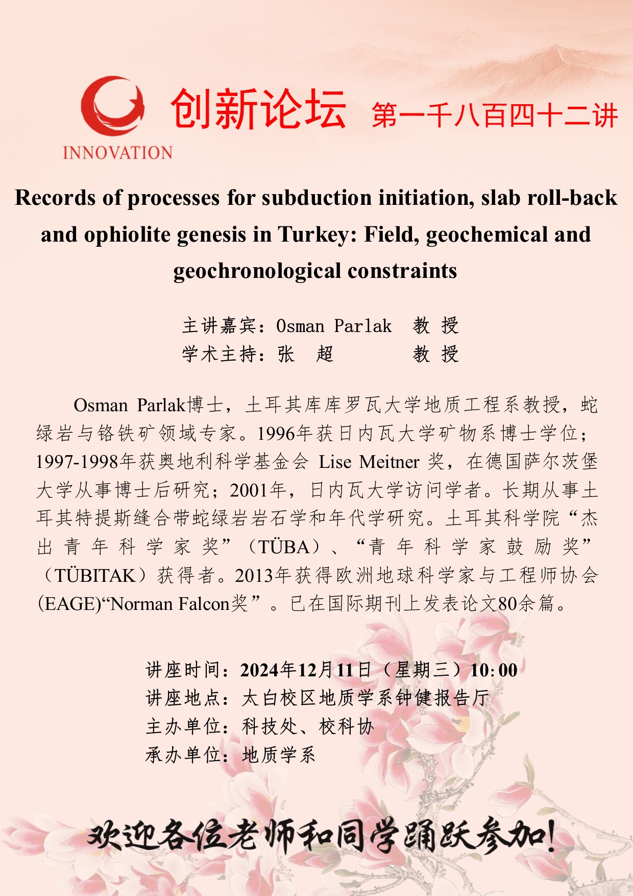 Osman Parlak 教授 广发体育创新论坛第一千八百四十二讲:Records of processes for subduction initiation, slab roll-back and ophiolite genesis in Turkey: Field, geochemical and geochronological constraints 讲座时间 2024年12月11日(星期三)10:00 讲座地点 太白校区地质学系钟健报告厅 讲座人介绍 Osman Parlak 教授 讲座内容