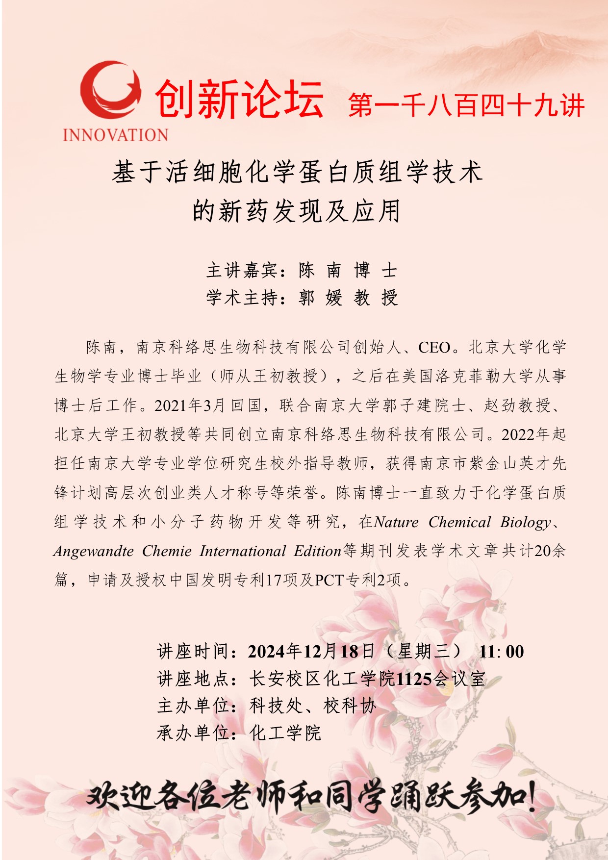 陈南 博士 广发体育创新论坛第一千八百四十九讲:基于活细胞化学蛋白质组学技术的新药发现及应用 讲座时间 2024年12月18日(星期三)11: 00 讲座地点 长安校区化工学院1125会议室 讲座人介绍 陈南 博士 讲座内容
