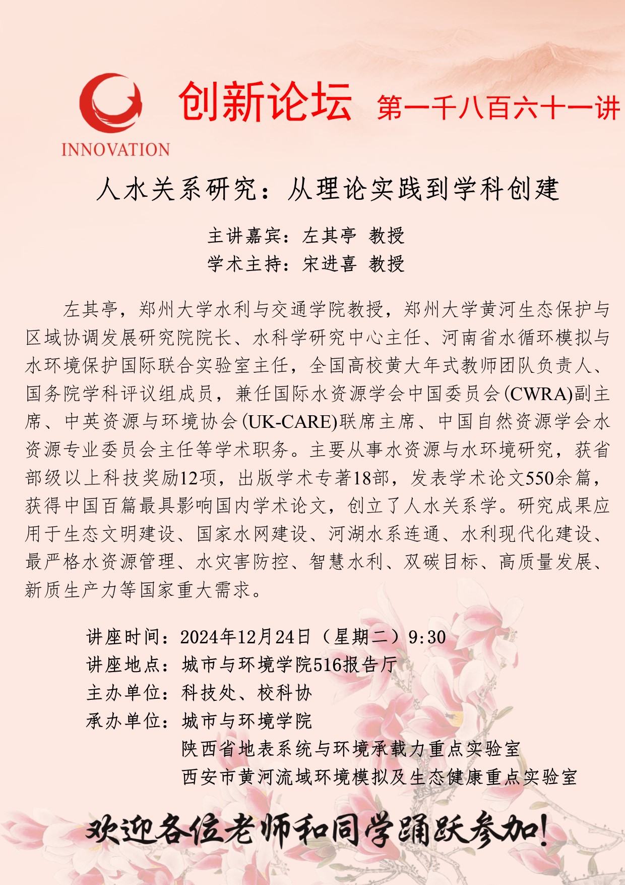 左其亭 教授 广发体育创新论坛第一千八百六十一讲:人水关系研究:从理论实践到学科创建 讲座时间 2024年12月24日(星期二)9:30 讲座地点 城市与环境学院516报告厅 讲座人介绍 左其亭 教授 讲座内容