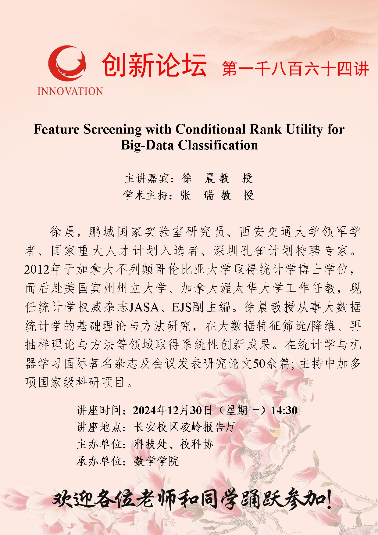 徐晨 教授 广发体育创新论坛第一千八百六十四讲:Feature Screening with Conditional Rank Utility for Big-Data Classification 讲座时间 2024年12月30日(星期一)14:30 讲座地点 长安校区凌岭报告厅 讲座人介绍 徐晨 教授 讲座内容