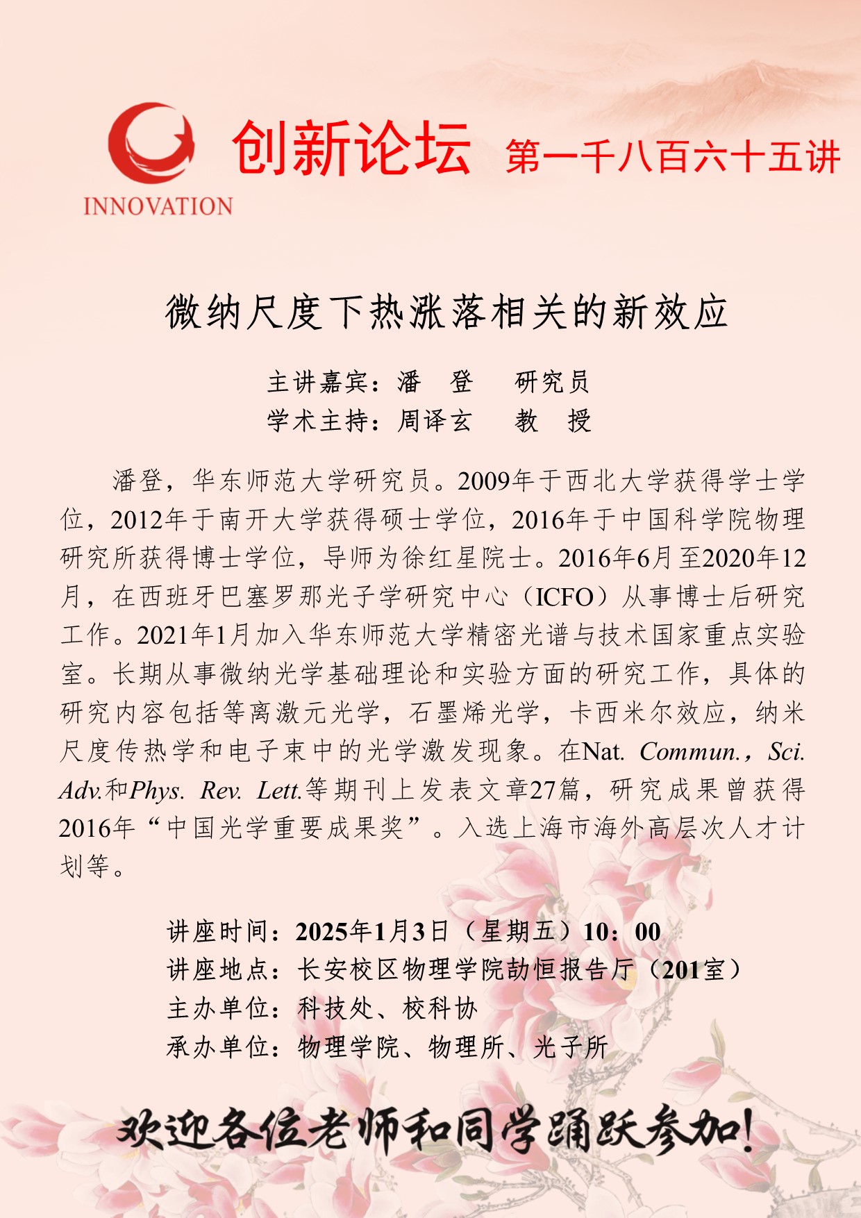 潘登 研究员 广发体育创新论坛第一千八百六十五讲:微纳尺度下热涨落相关的新效应 讲座时间 2025年1月3日(星期五)10:00 讲座地点 长安校区物理学院劼恒报告厅(201室) 讲座人介绍 潘登 研究员 讲座内容