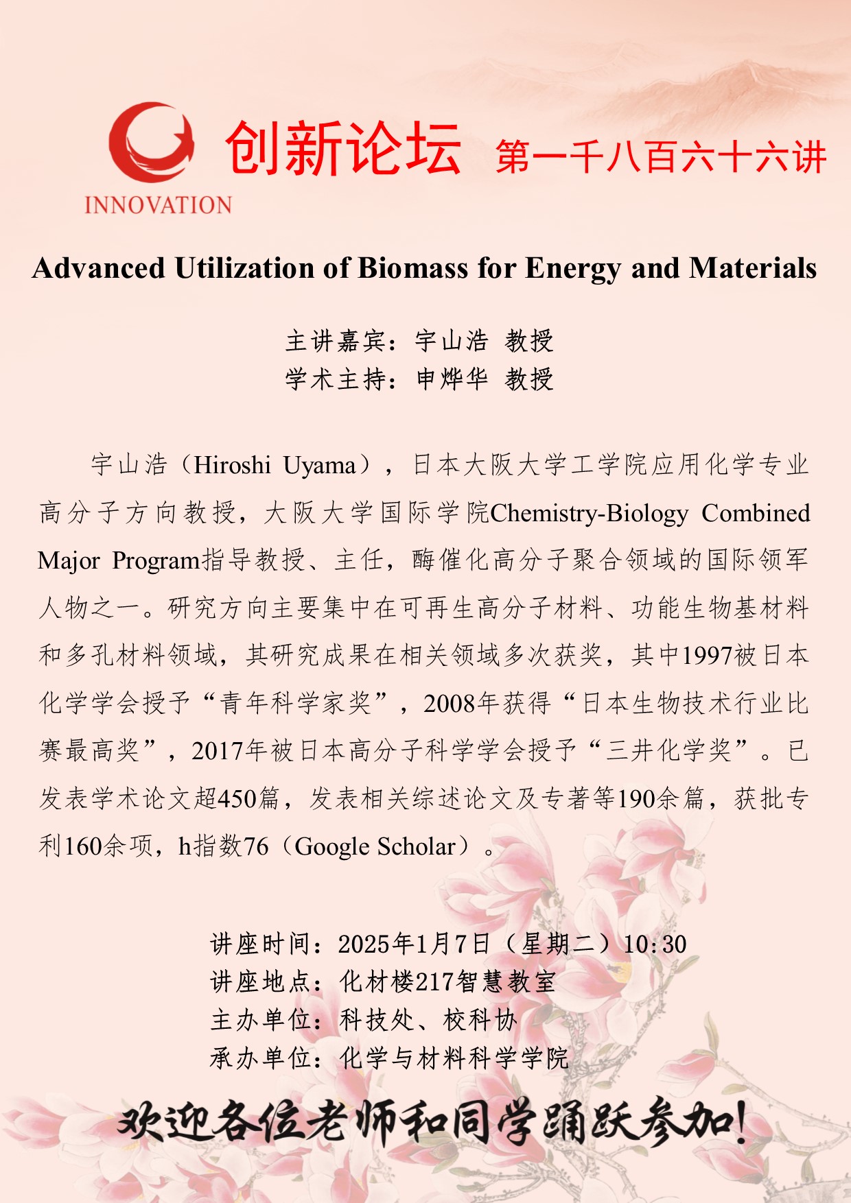 宇山浩 教授 广发体育创新论坛第一千八百六十六讲:Advanced Utilization of Biomass for Energy and Materials 讲座时间 2025年1月7日(星期二)10:30 讲座地点 化材楼217智慧教室 讲座人介绍 宇山浩 教授 讲座内容