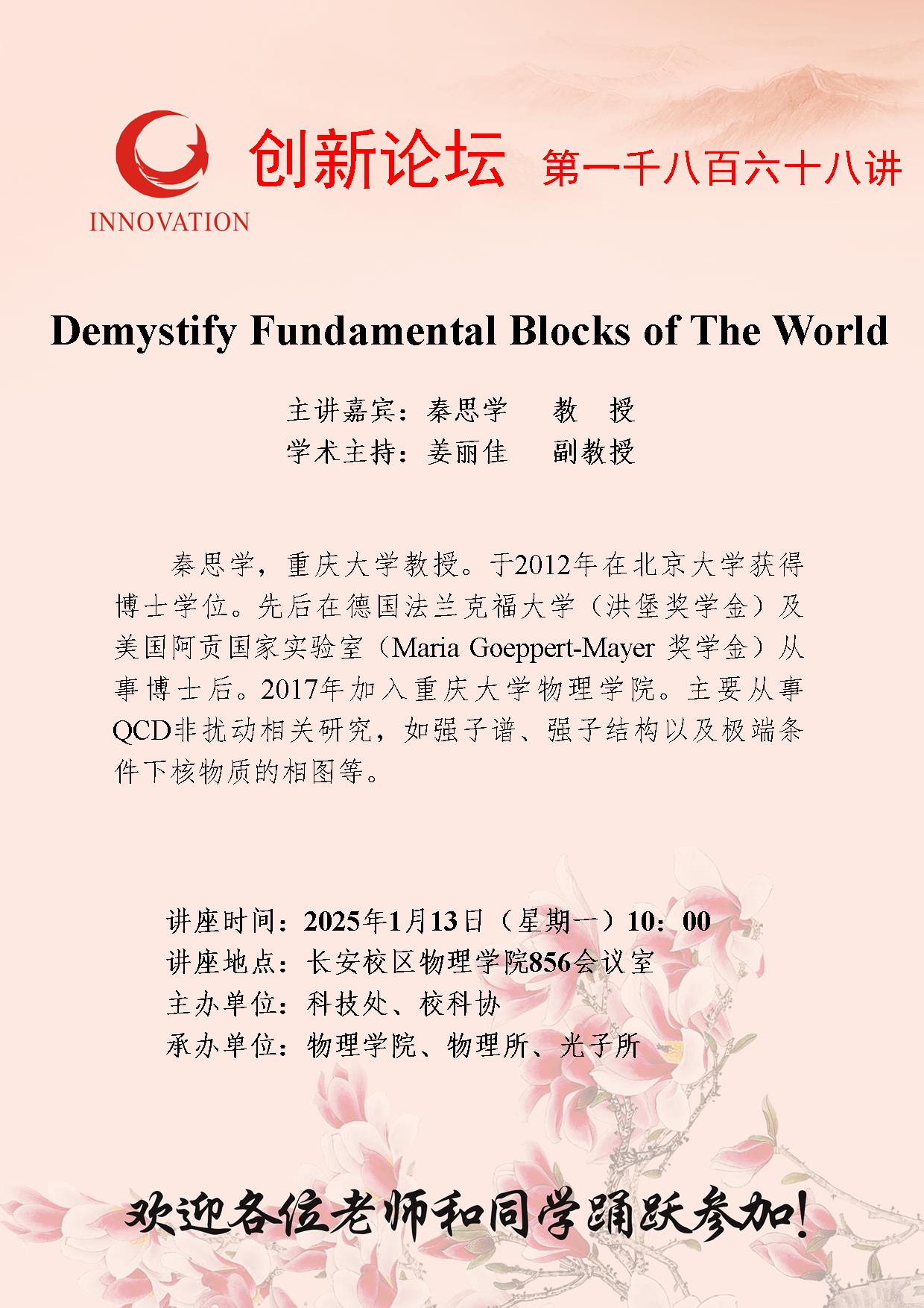 秦思学 教授 广发体育创新论坛第一千八百六十八讲:Demystify Fundamental Blocks of The World 讲座时间 2025年1月13日(星期一)10:00 讲座地点 长安校区物理学院856会议室 讲座人介绍 秦思学 教授 讲座内容