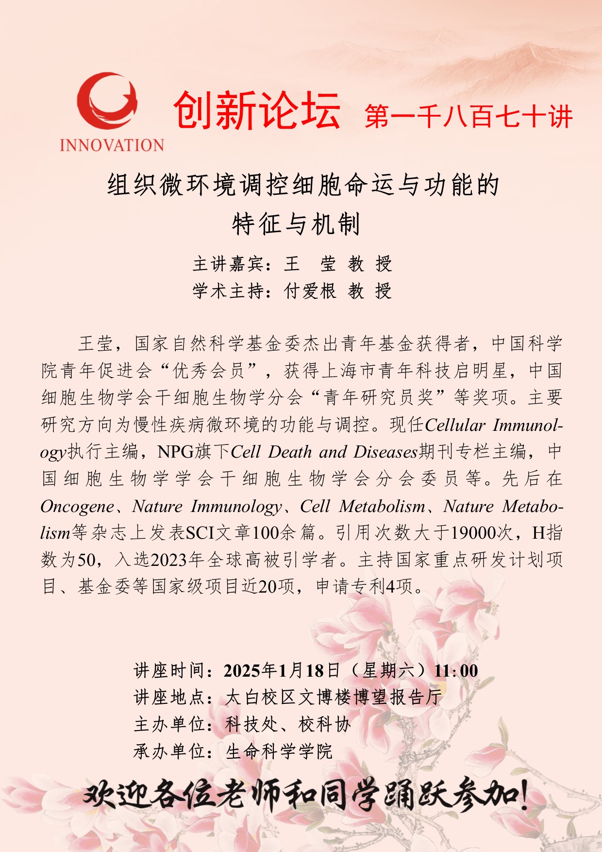 王莹 教授 广发体育创新论坛第一千八百七十讲:组织微环境调控细胞命运与功能的特征与机制 讲座时间 2025年1月18日(星期六)11:00 讲座地点 太白校区文博楼博望报告厅 讲座人介绍 王莹 教授 讲座内容