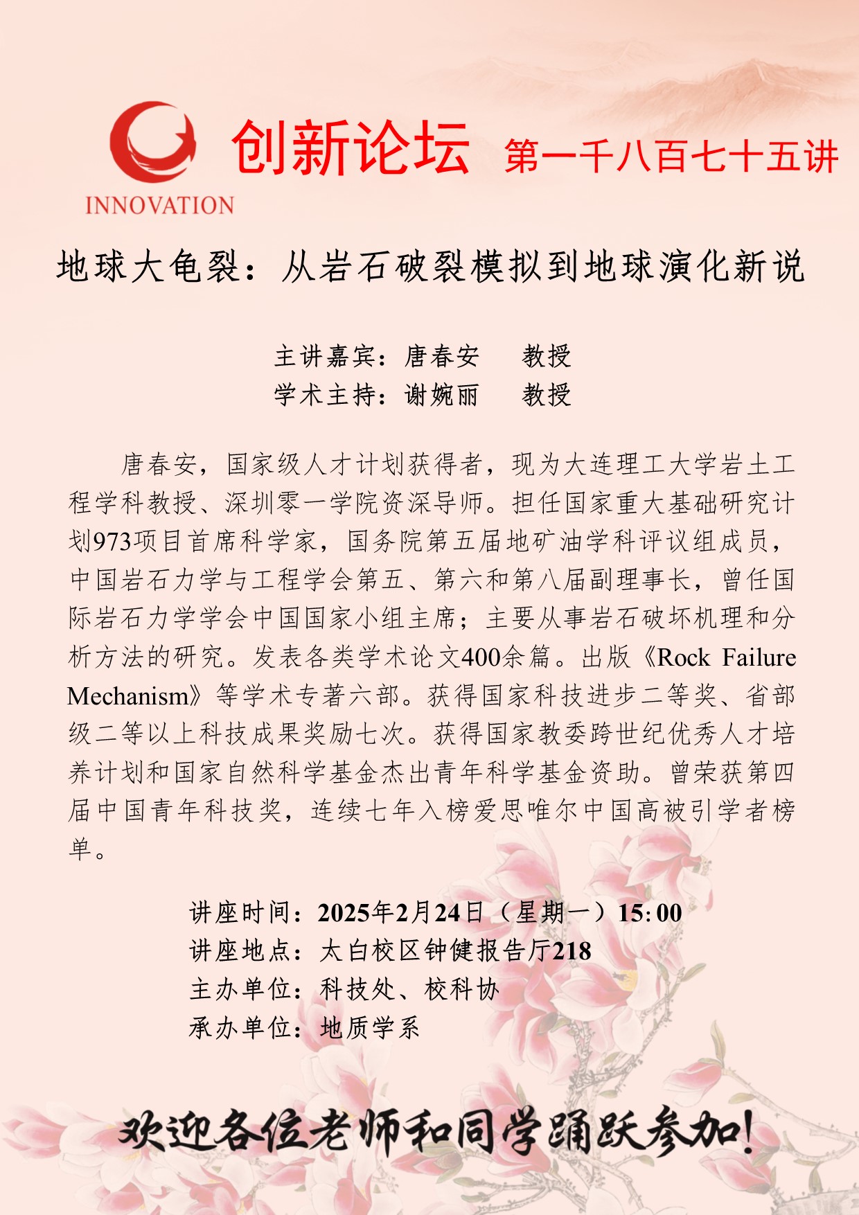 唐春安 教授 广发体育创新论坛第一千八百七十五讲:地球大龟裂:从岩石破裂模拟到地球演化新说 讲座时间 2025年2月24日(星期一)15:00 讲座地点 太白校区钟健报告厅218 讲座人介绍 唐春安 教授 讲座内容