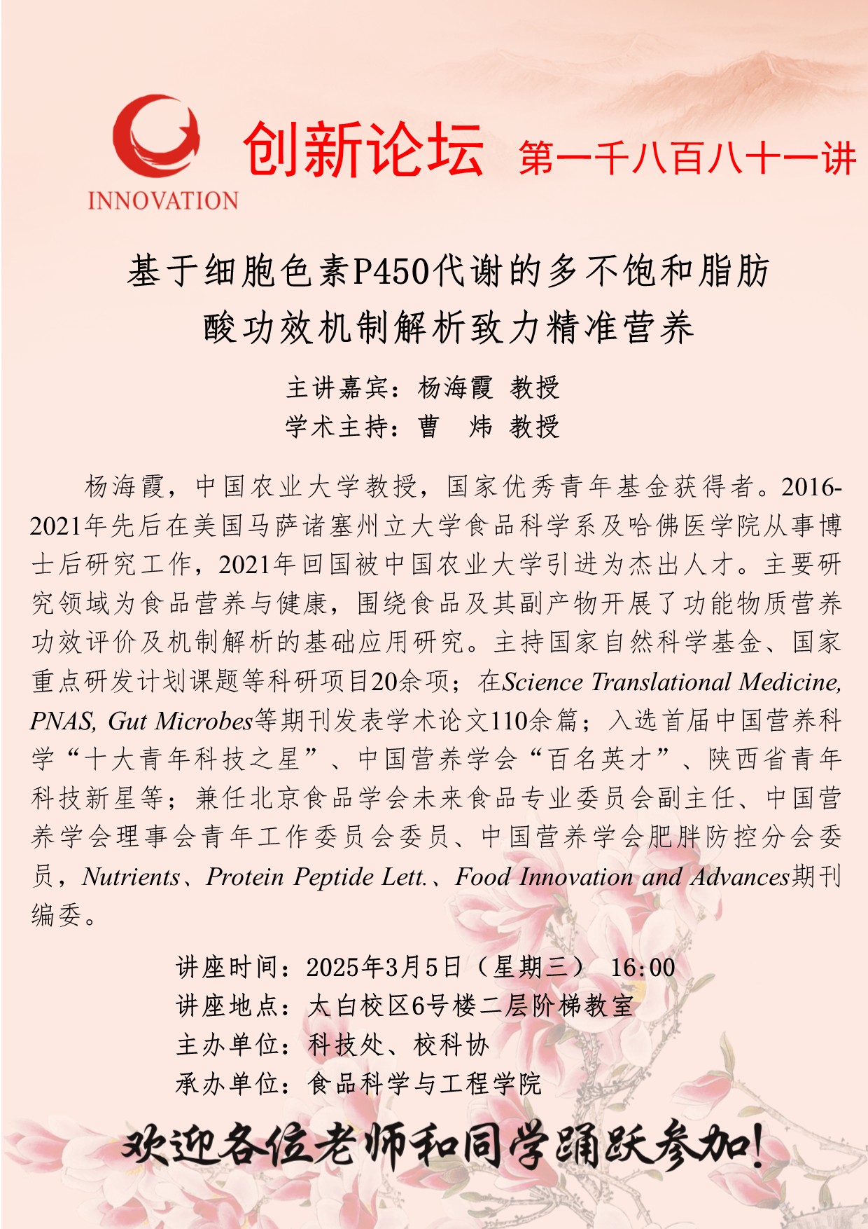 杨海霞 教授 广发体育创新论坛第一千八百八十一讲:基于细胞色素P450代谢的多不饱和脂肪酸功效机制解析致力精准营养 讲座时间 2025年3月5日(星期三)16:00 讲座地点 太白校区6号楼二层阶梯教室 讲座人介绍 杨海霞 教授 讲座内容