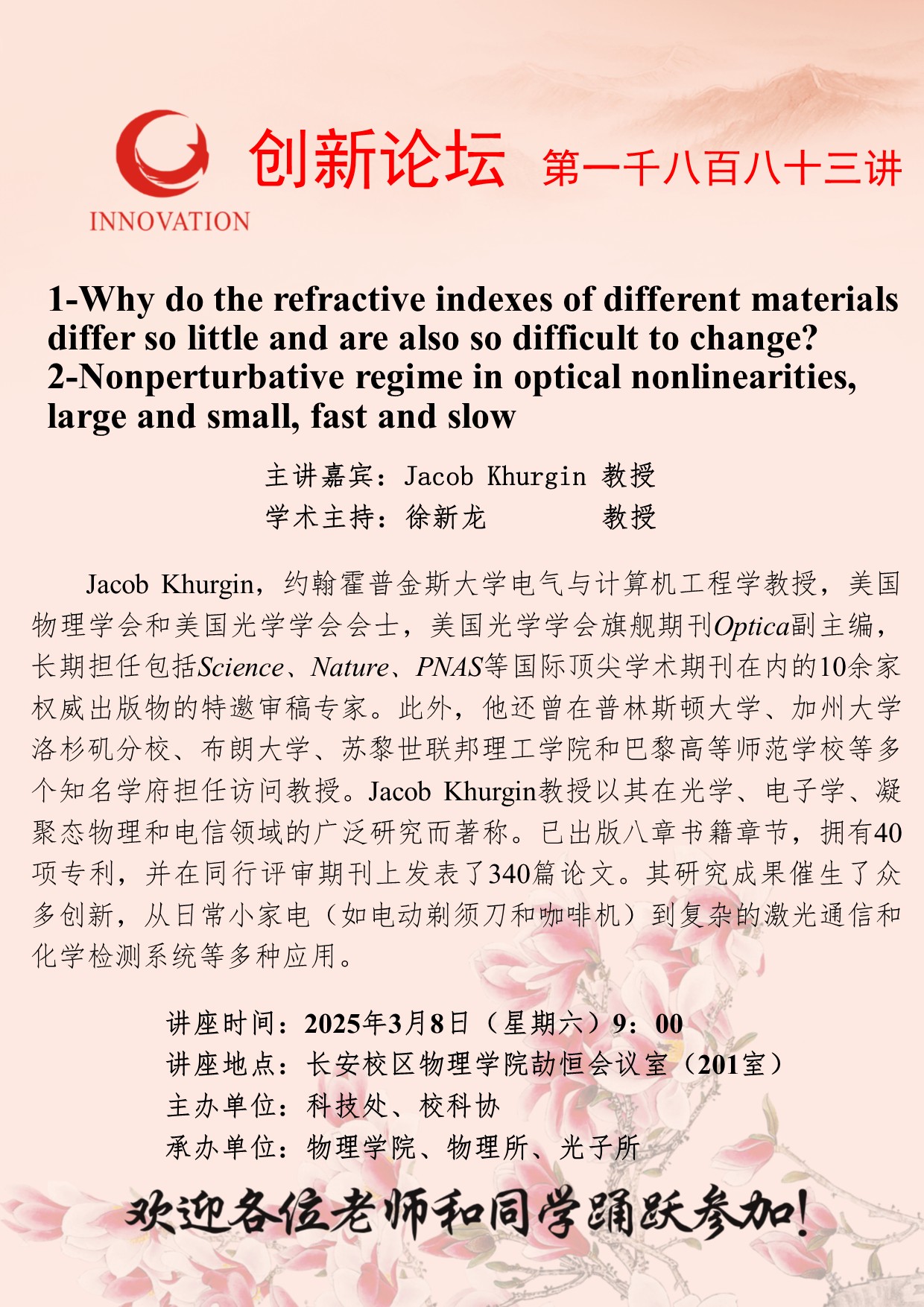 Jacob Khurgin 教授 广发体育创新论坛第一千八百八十三讲:1-Why do the refractive indexes of different materials differ so little and are also so difficult to change? 讲座时间 2025年3月8日(星期六)9:00 讲座地点 长安校区物理学院劼恒会议室(201室) 讲座人介绍 Jacob Khurgin 教授 讲座内容