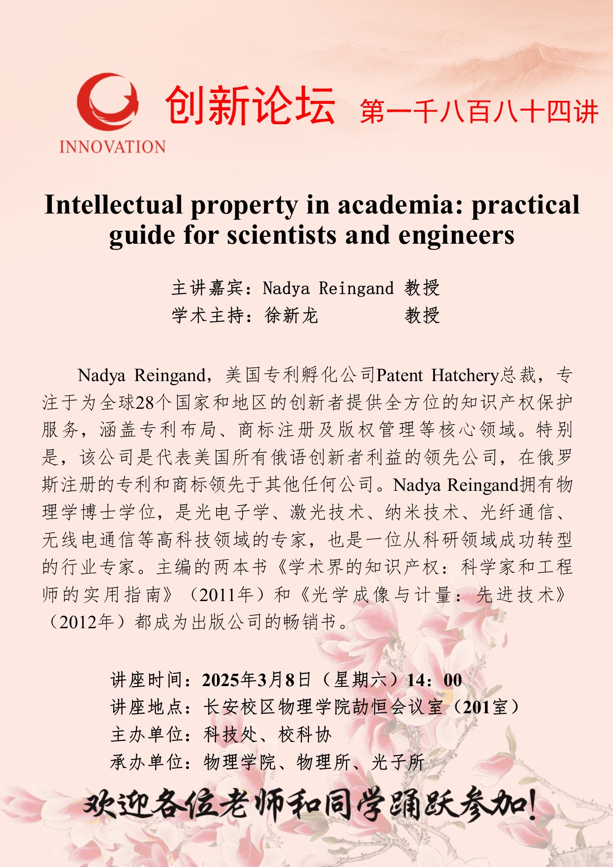 Nadya Reingand 教授 广发体育创新论坛第一千八百八十四讲:Intellectual property in academia: practical guide for scientists and engineers 讲座时间 2025年3月8日(星期六)14:00 讲座地点 长安校区物理学院劼恒会议室(201室) 讲座人介绍 Nadya Reingand 教授 讲座内容