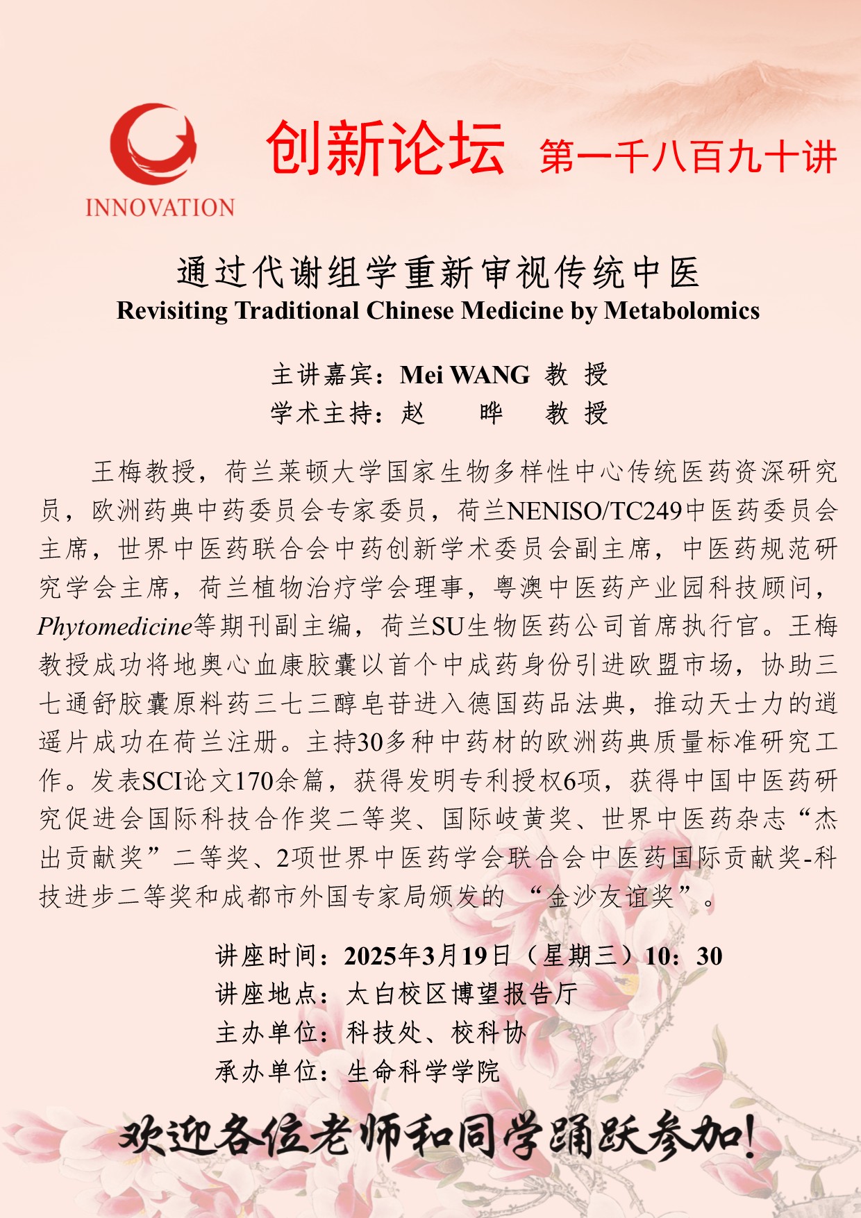 Mei WANG 教授 广发体育创新论坛第一千八百九十讲:通过代谢组学重新审视传统中医Revisiting Traditional Chinese Medicine by Metabolomics 讲座时间 2025年3月19日(星期三)10:30 讲座地点 太白校区博望报告厅 讲座人介绍 Mei WANG 教授 讲座内容