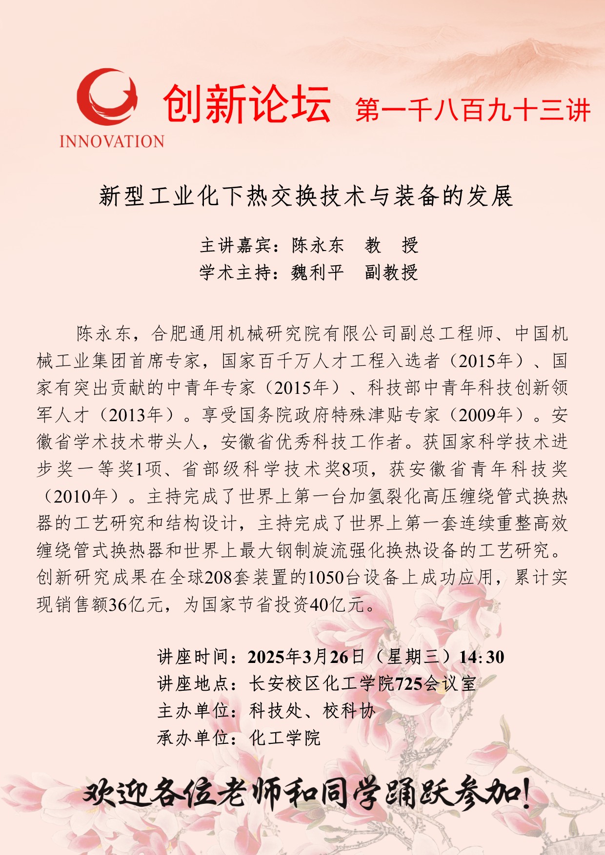 陈永东 教授 广发体育创新论坛第一千八百九十三讲:新型工业化下热交换技术与装备的发展 讲座时间 2025年3月26日(星期三)14:30 讲座地点 长安校区化工学院725会议室 讲座人介绍 陈永东 教授 讲座内容
