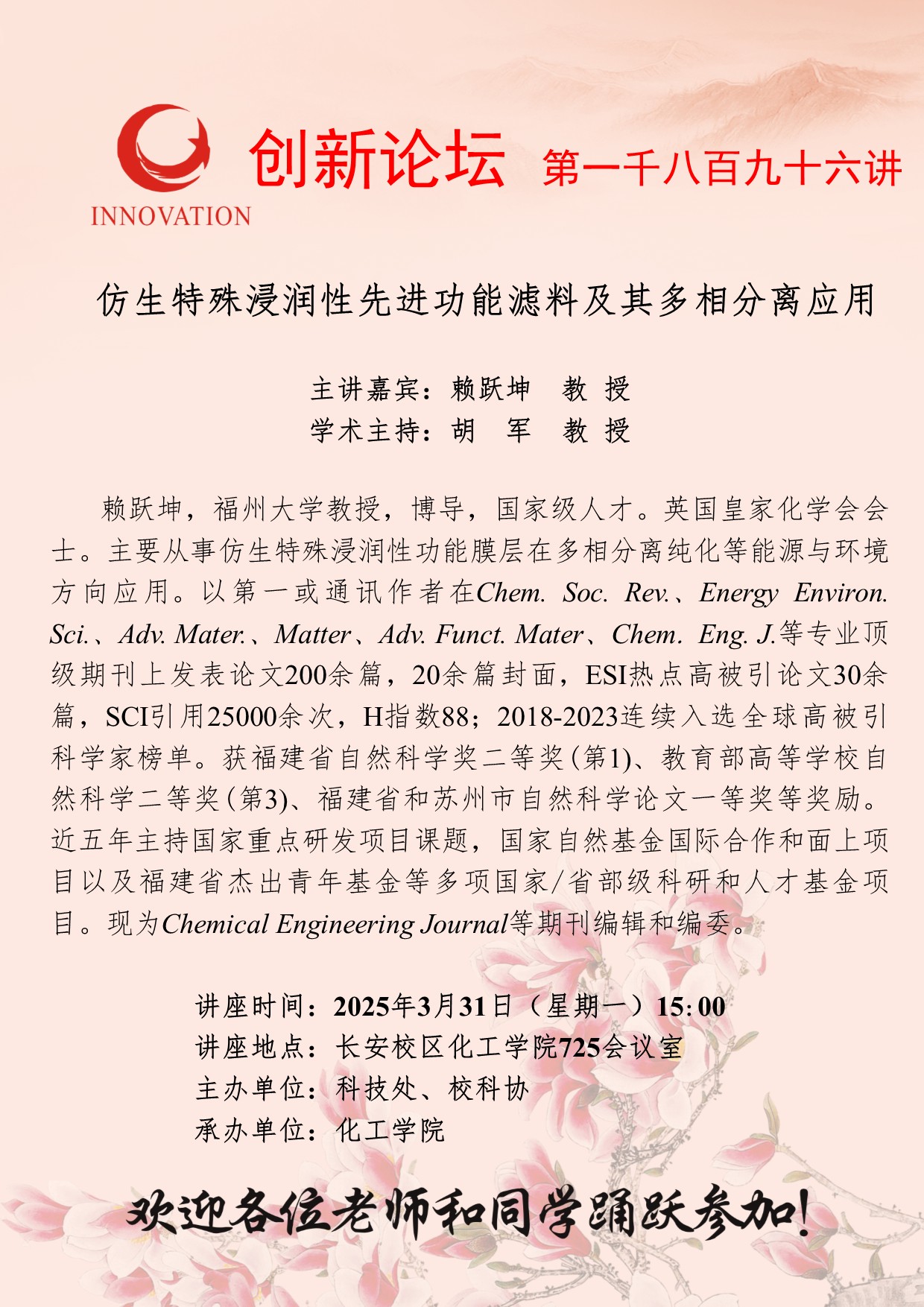 赖跃坤 教授 广发体育创新论坛第一千八百九十六讲:仿生特殊浸润性先进功能滤料及其多相分离应用 讲座时间 2025年3月31日(星期一)15:00 讲座地点 长安校区化工学院725会议室 讲座人介绍 赖跃坤 教授 讲座内容
