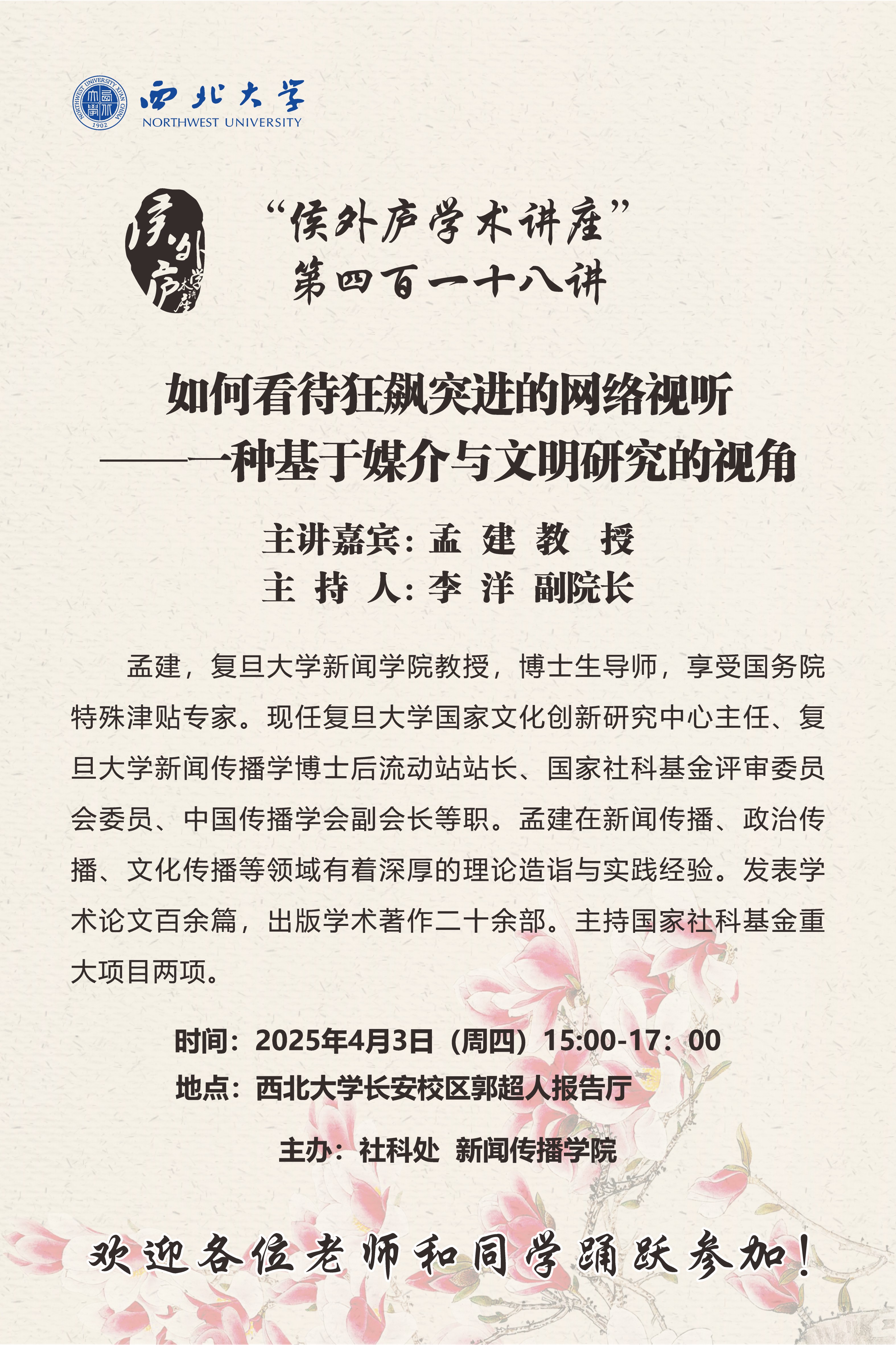 孟建 教授 “侯外庐学术讲座”第四百一十八讲:如何看待狂飙突进的网络视听——一种基于媒介与文明研究的视角 讲座时间 2025年4月3日(周四)15:00-17:00 讲座地点 广发体育长安校区郭超人报告厅 讲座人介绍 孟建 教授 讲座内容