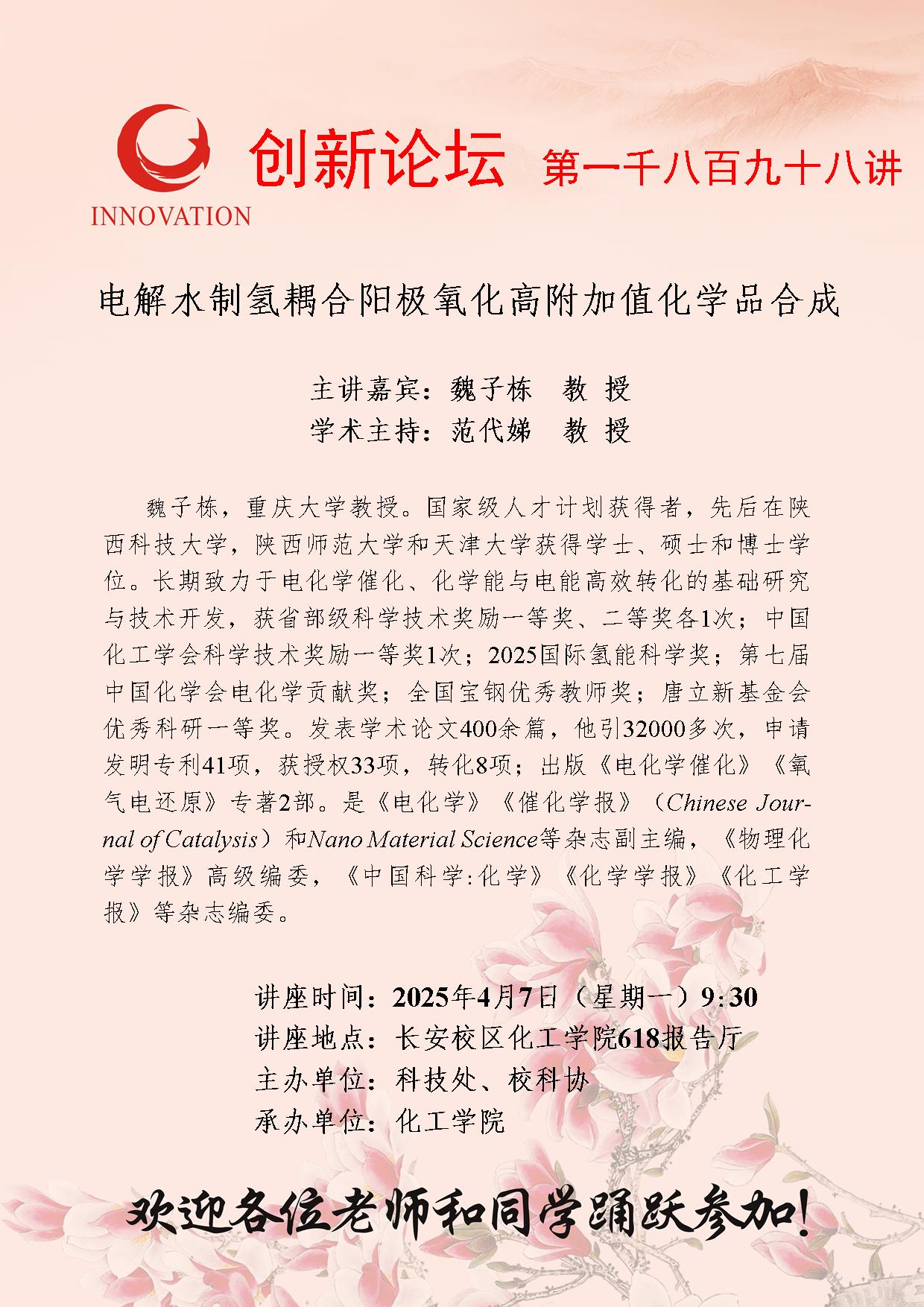 魏子栋 教授 广发体育创新论坛第一千八百九十八讲:电解水制氢耦合阳极氧化高附加值化学品合成 讲座时间 2025年4月7日(星期一)9:30 讲座地点 长安校区化工学院618报告厅 讲座人介绍 魏子栋 教授 讲座内容