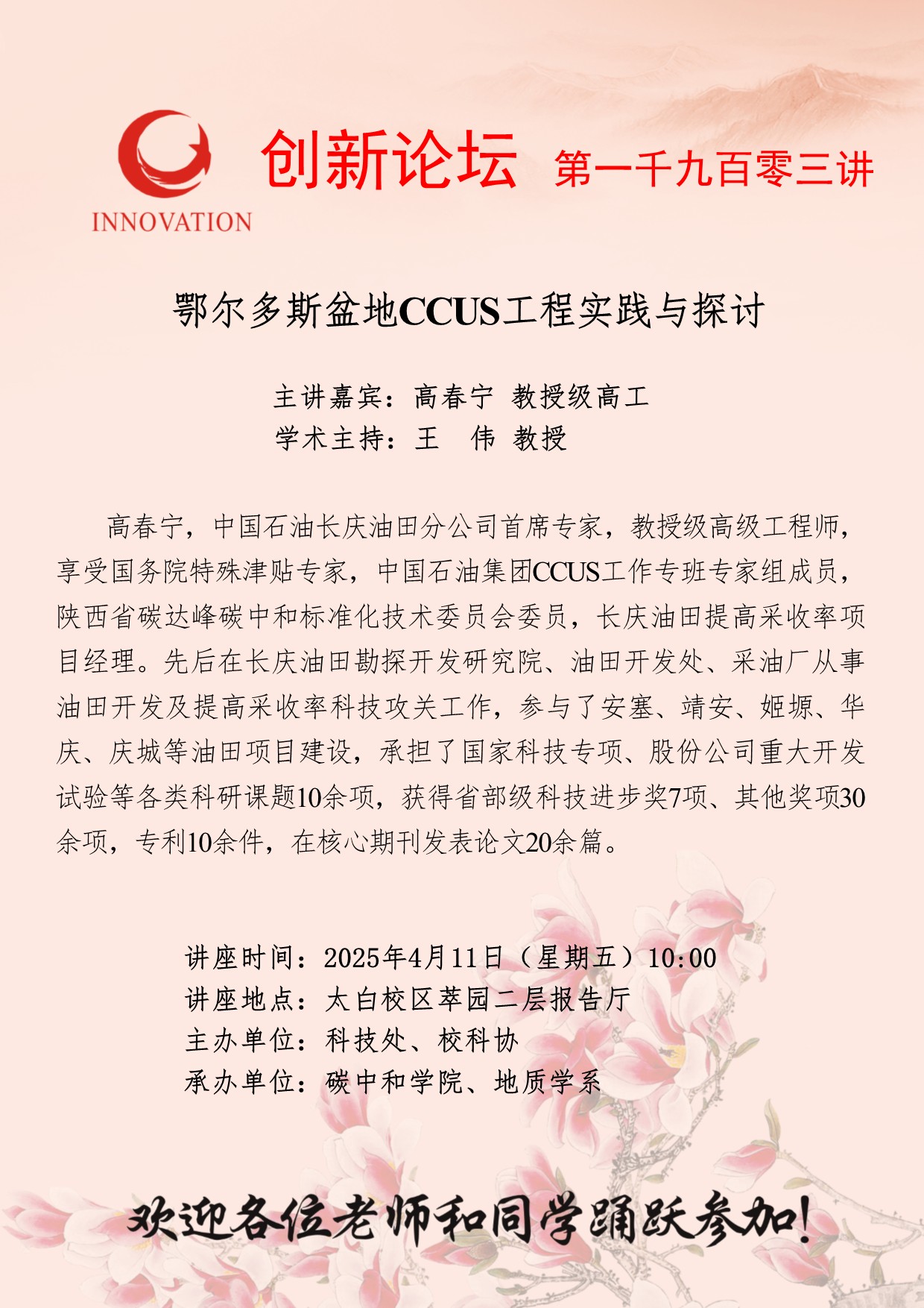 高春宁 教授级高工 广发体育创新论坛第一千九百零三讲:鄂尔多斯盆地CCUS工程实践与探讨 讲座时间 2025年4月11日(星期五)10:00 讲座地点 太白校区萃园二层报告厅 讲座人介绍 高春宁 教授级高工 讲座内容
