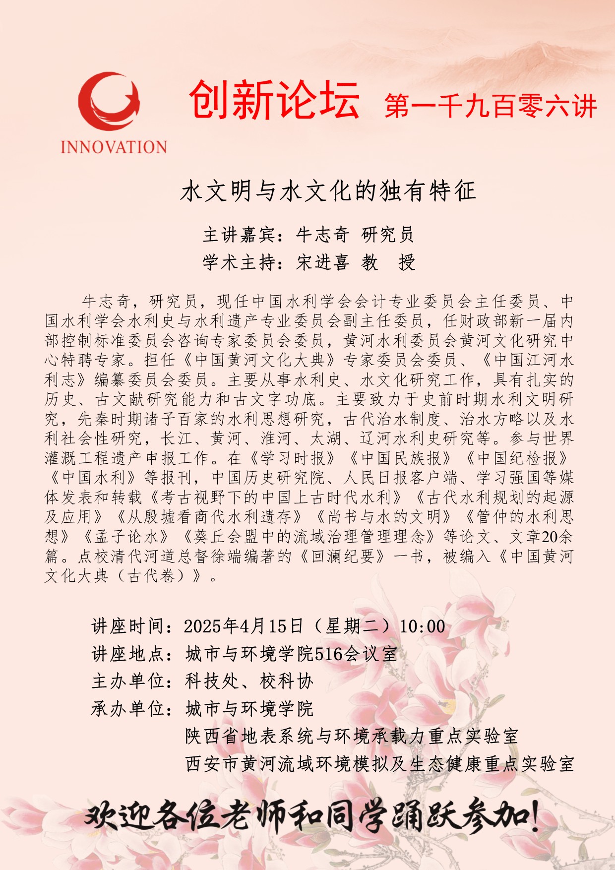 牛志奇 研究员 广发体育创新论坛第一千九百零六讲:水文明与水文化的独有特征 讲座时间 2025年4月15日(星期二)10:00 讲座地点 城市与环境学院516会议室 讲座人介绍 牛志奇 研究员 讲座内容