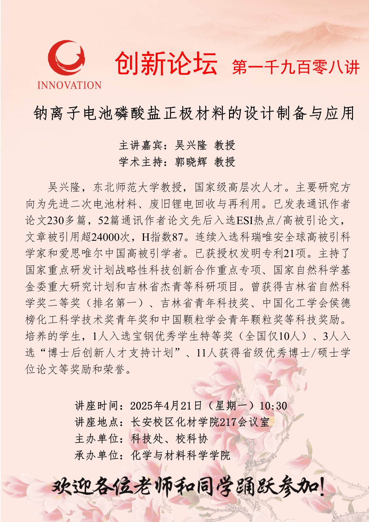 吴兴隆 教授 广发体育创新论坛第一千九百零八讲:钠离子电池磷酸盐正极材料的设计制备与应用 讲座时间 2025年4月21日(星期一)10:30 讲座地点 长安校区化材学院217会议室 讲座人介绍 吴兴隆 教授 讲座内容