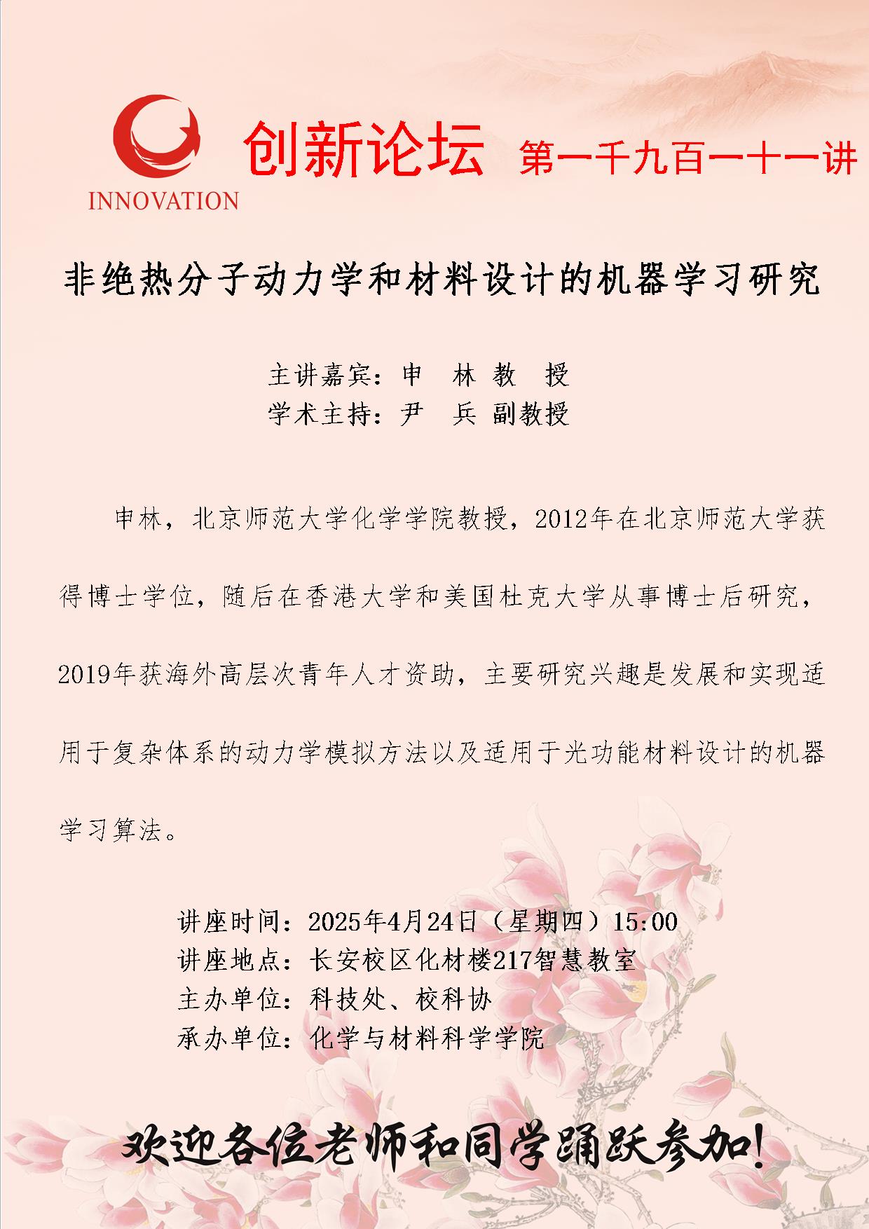 申林 教授 广发体育创新论坛第一千九百一十一讲:非绝热分子动力学和材料设计的机器学习研究 讲座时间 2025年4月24日(星期四)15:00 讲座地点 长安校区化材楼217智慧教室 讲座人介绍 申林 教授 讲座内容
