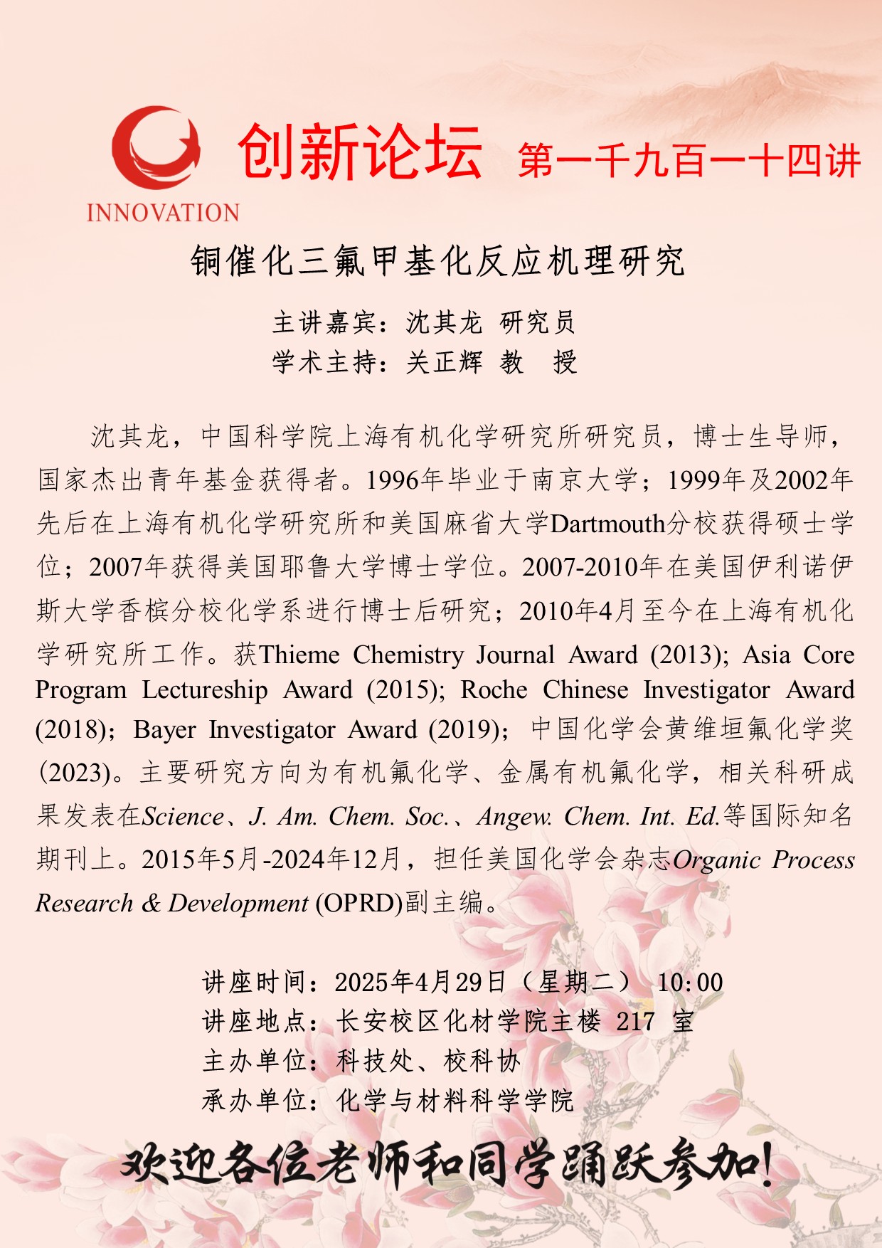 沈其龙 研究员 广发体育创新论坛第一千九百一十四讲:铜催化三氟甲基化反应机理研究 讲座时间 2025年4月29日(星期二) 10:00 讲座地点 长安校区化材学院主楼 217 室 讲座人介绍 沈其龙 研究员 讲座内容